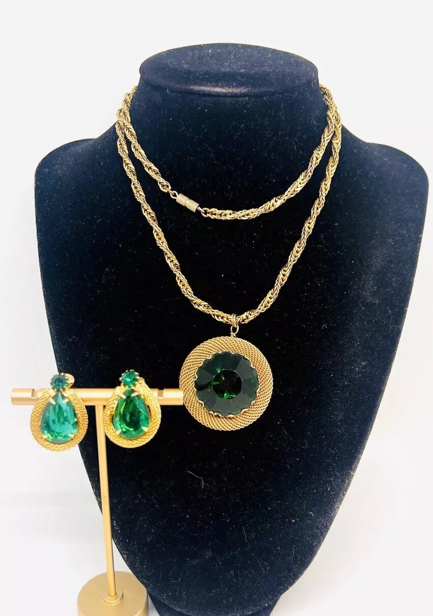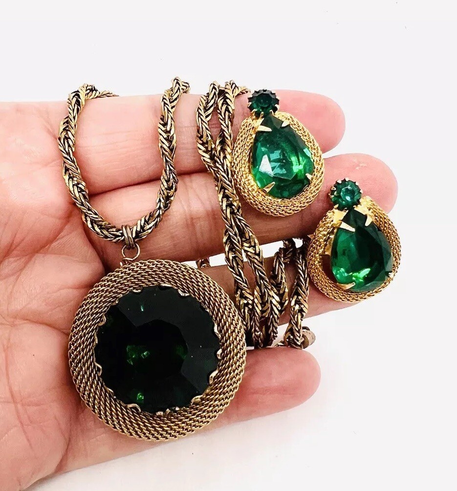 Beautiful Vintage Jewel Tone Emerald Green Rhinestone Mesh Necklace & Earrings Demi. Gold tone mesh metal set with gorgeous emerald green rhinestones. In great vintage condition with age appropriate wear. Necklace has more wear than earrings especially on back. It probably got worn more. The earrings actually look unworn. No chips or cracks. Pendant measures 1 3/4 inches long by 1 1/2 inches wide. The unusual and thick chain is 1/8 inch thick. Total length is 24 inches. Has secure barrel clasp. The matching earrings are clip back and measure 1 1/8 inches tall by 3/4 inch wide.