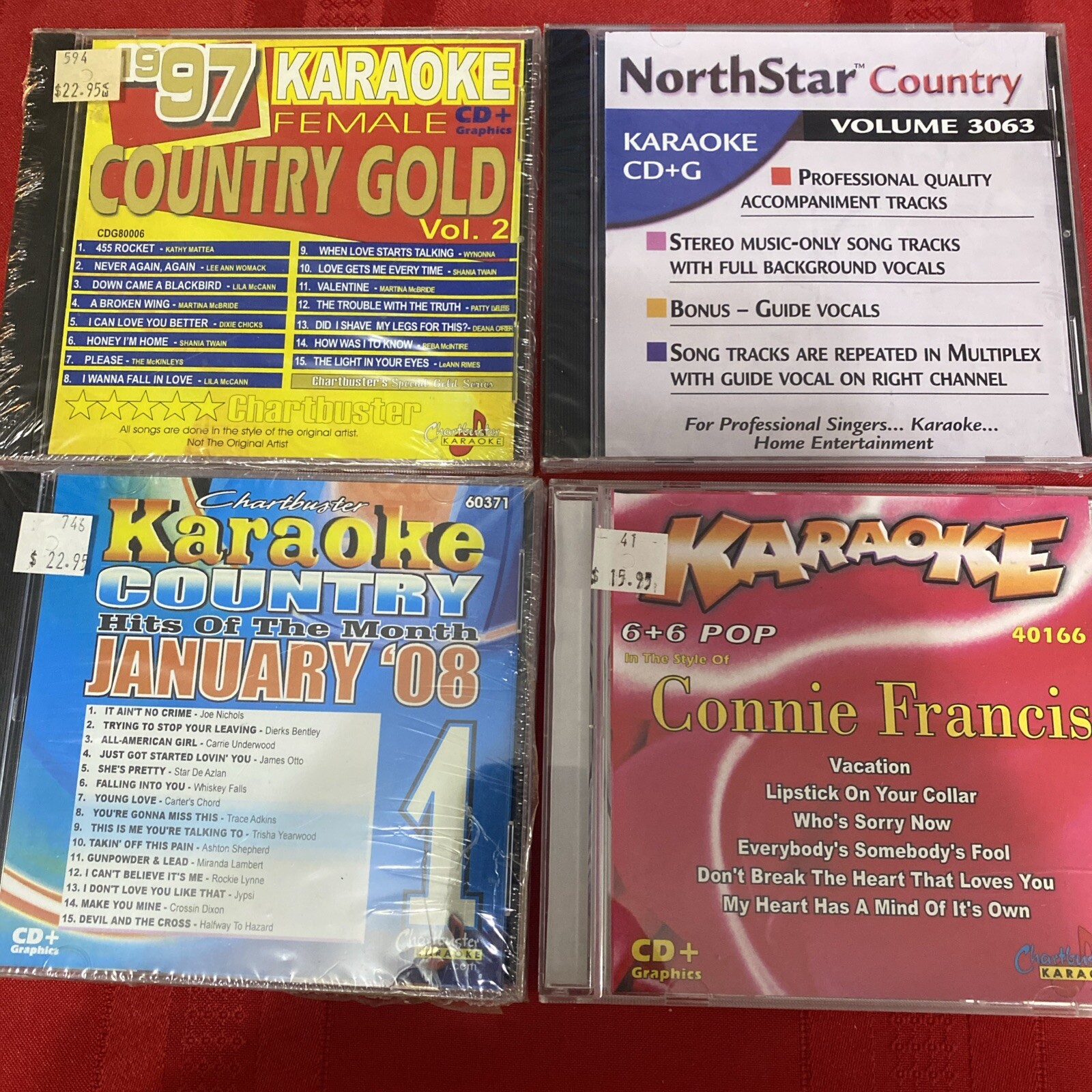 Get ready to sing your heart out with these 4 brand new Karaoke Country CD-G discs! Featuring a variety of country songs in English, these discs are perfect for any karaoke lover. The discs are compatible with any CD+G player and are made in the United States.With a multiplex of no, these discs allow for easy navigation and smooth playback. The file format is CD+G, and the media type is CD. These discs are a must-have for any karaoke enthusiast and are ready to be shipped to your doorstep.
