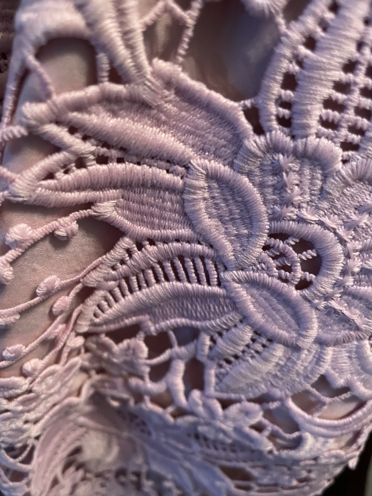 Nicholas Women's Bellflower Guipure Lace Sleeveless V-Neck Ball Dress in peony pink. Very Self Portrait in thick luxurious lace This is a stunning textured lace fit and flare cocktail dress with a deep v-neck. It could work as a casual summer outing or dressed up . Fits a 0-00Bust: 13”Waist: 11.5”Hem: approximately 47”
