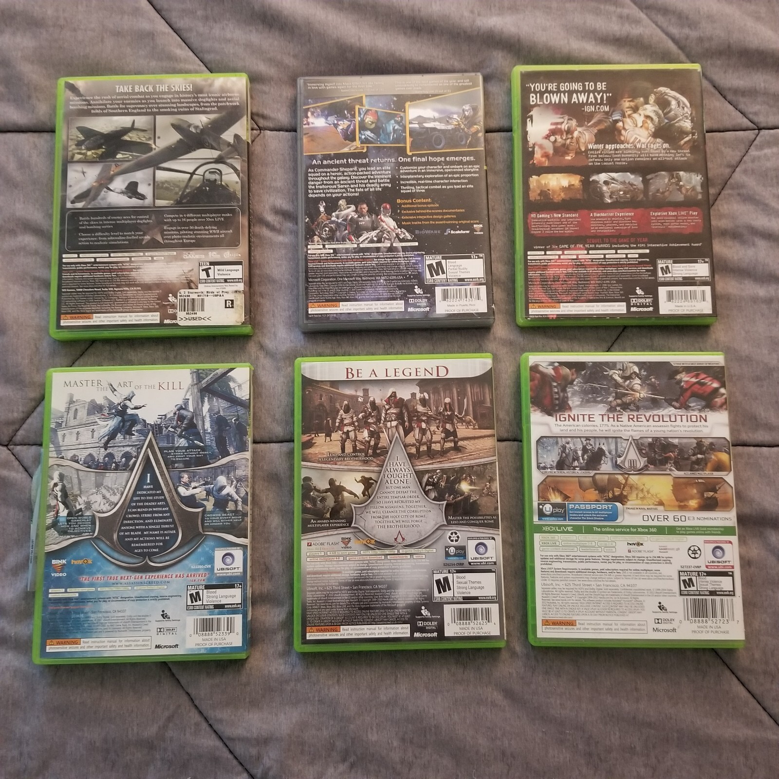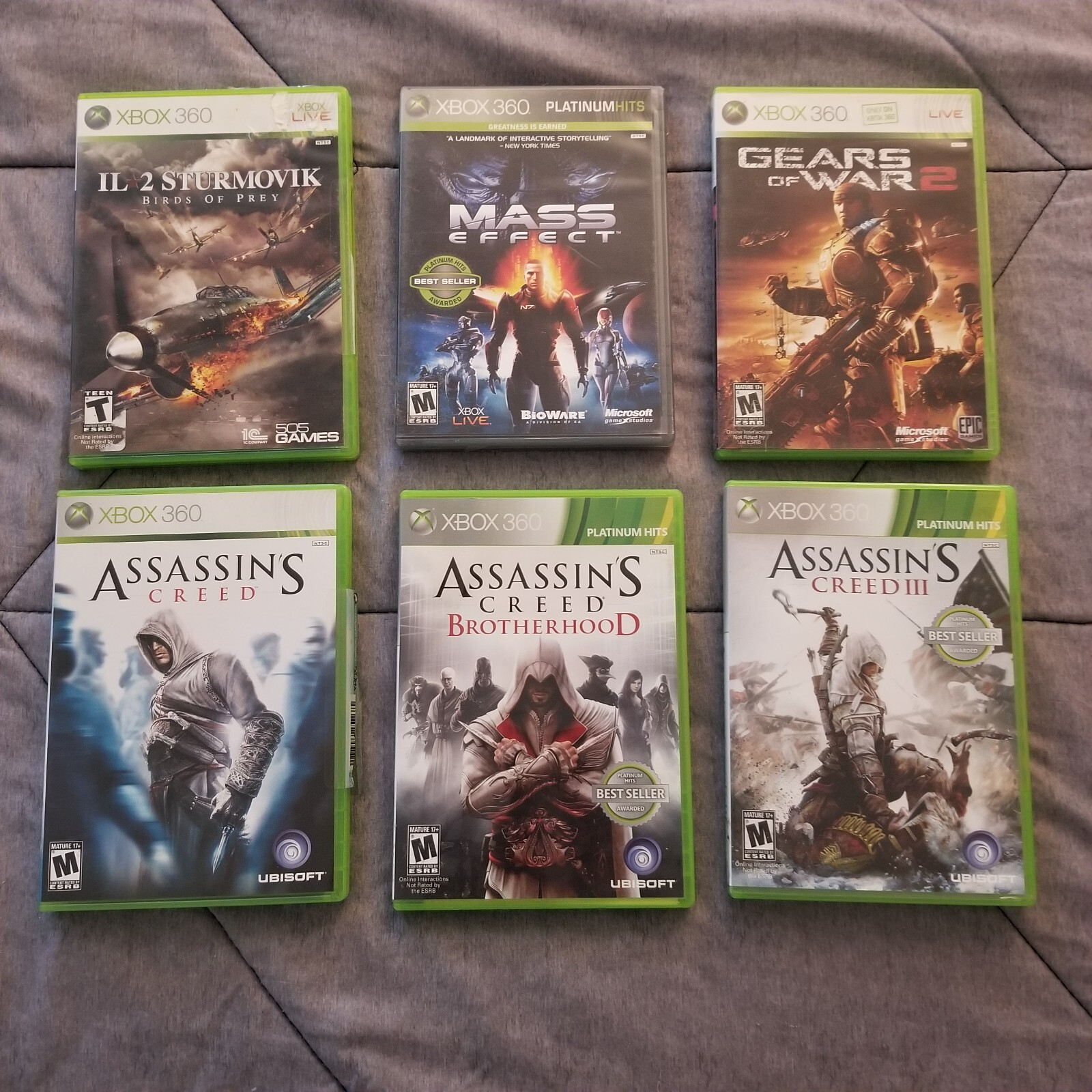 XBOX 360 Games - Assassins Creed, Gears of War 2, Mass Effect - Lot of 6 games1) Assassins Creed2) Assassins Creed - Brotherhood3) Assassins Creed 34) IL-2 Sturmovik: Birds of Prey5) Gears of War 26) Mass Effect