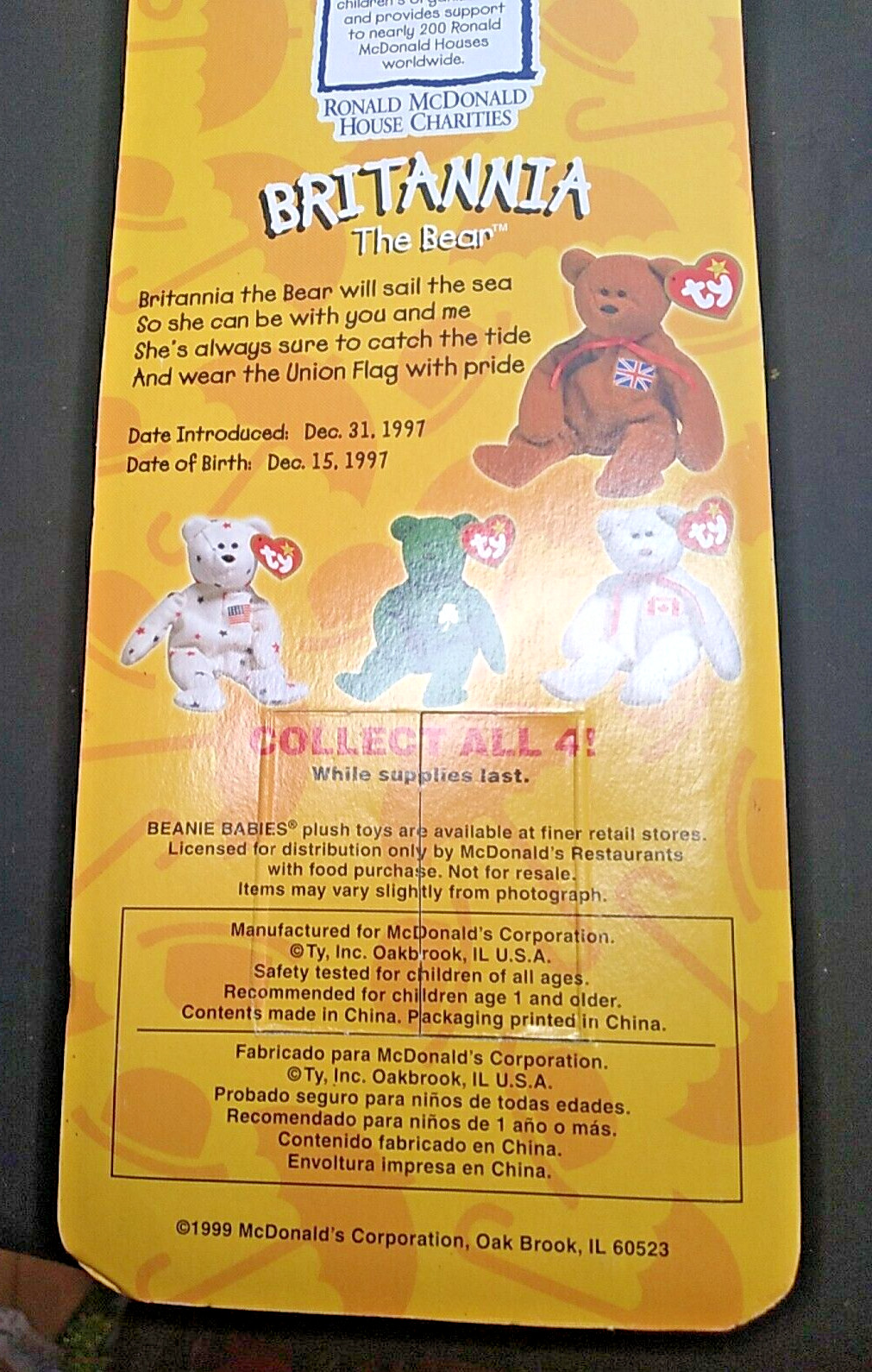 TY Britannia for McDonald's Charities HouseNew in box, never removed from box although the perforated double door on the back have been opened to reveal the tush tag Errors include born in 1997 on box and tush tag reads 1993 No space between Oak and Brook on tush tag but there is on the box.