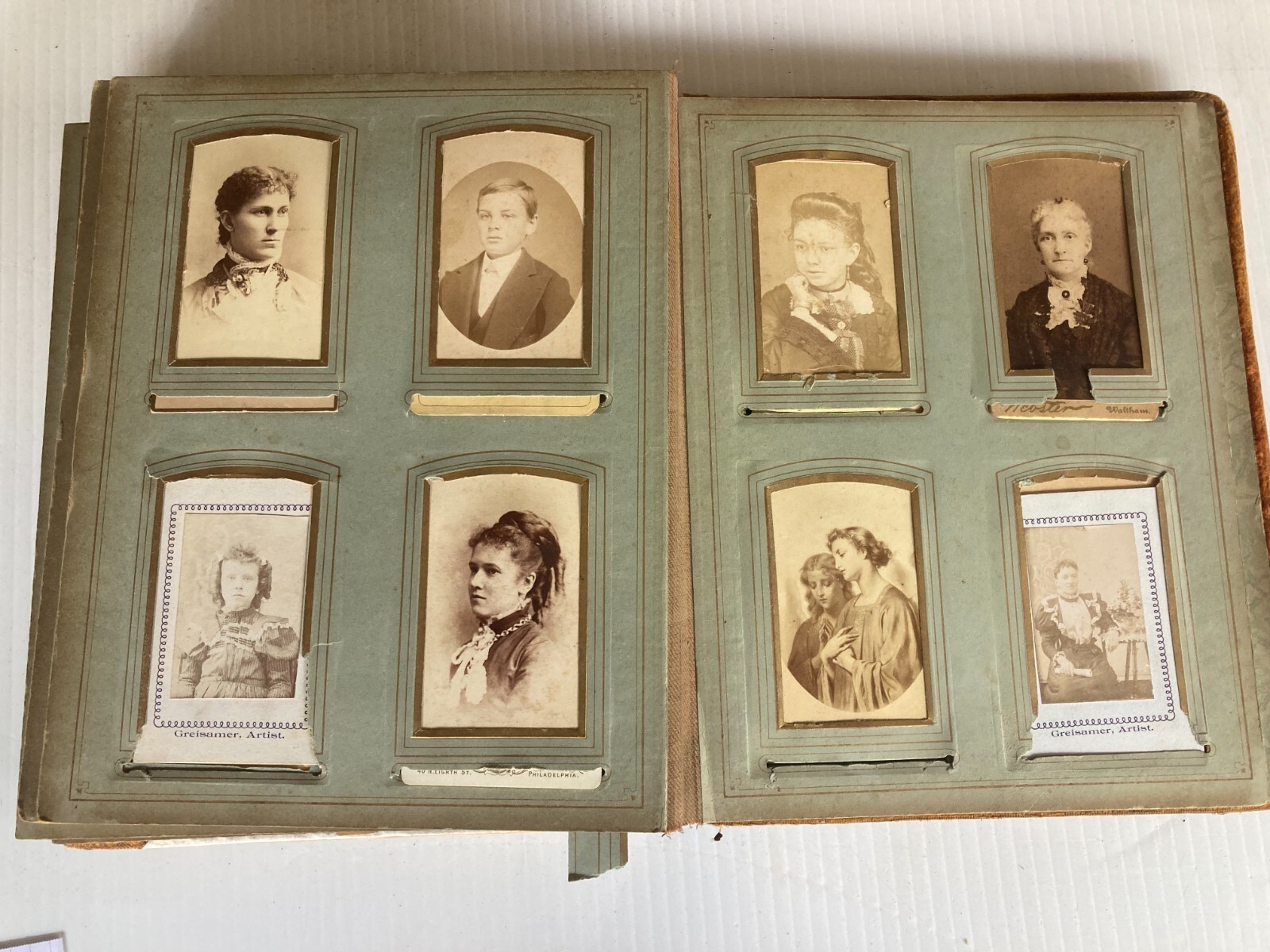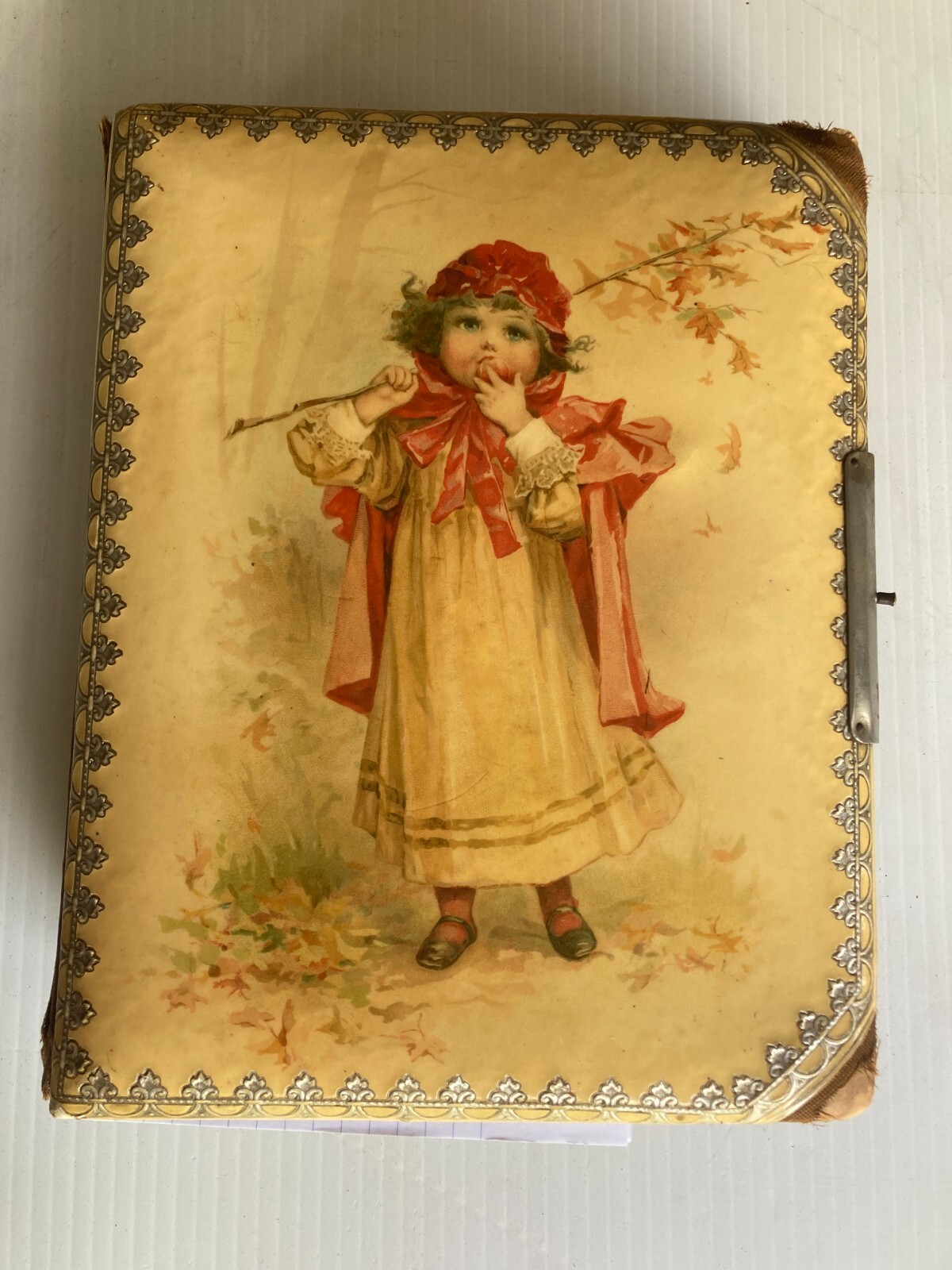 For sale is this antique family photograph cabinet card album. In well used as found condition, this album has a great celluloid cover of a young girl in a red cape. The album contains 24 large and 15 small cabinet cards. Several of the photos were taken by photographers in the Reading Pa to New York Area. The only name I found was an obituary card of Rosa A. Clay who died in Oct. 1888 at the age of 31. The album shows much wear and foxing of the pages. It is missing most of the clasp and the velvet is largely worn off. Hoping this will find its way back to the family, whoever they may be. Please view photos to verify condition as this is the item you will receive.