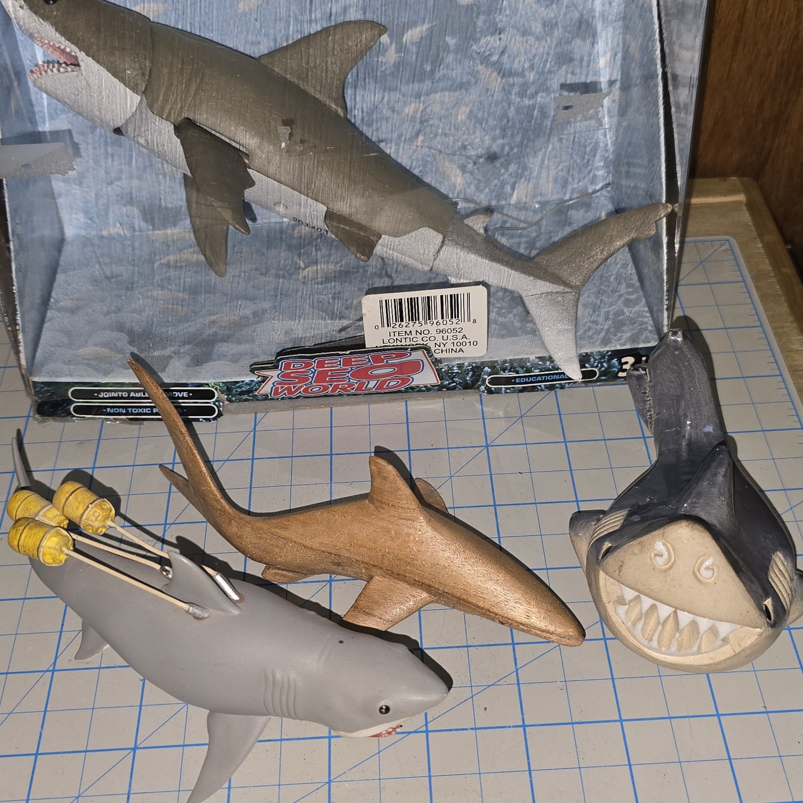 FOUR VERY COOL Vintage Shark Collectibles! LooK FOUR Great vintage shark collectibles. All are untested. Sold as-is and as-shown. One is in the original box, one is wooden, one is pottery, and one is Jaws shark with barrels attached. Please see the pictures as part of the description. Review my feedback and buy with confidence. Please click on my Ebay Store and see my other items. Some GREAT collectibles at cool “buy it now” prices in my Store! I am a purveyor of artifacts and a wrangler of no evil monkey collectibles. I have LOTS of cool collectibles! PLEASE check out my Store and have some fun like Ebay is supposed to be! You will be entertained!!Please bookmark my Store and check often. I am listing 60 years of gathered goods and add items from the collection regularly! Thank you.