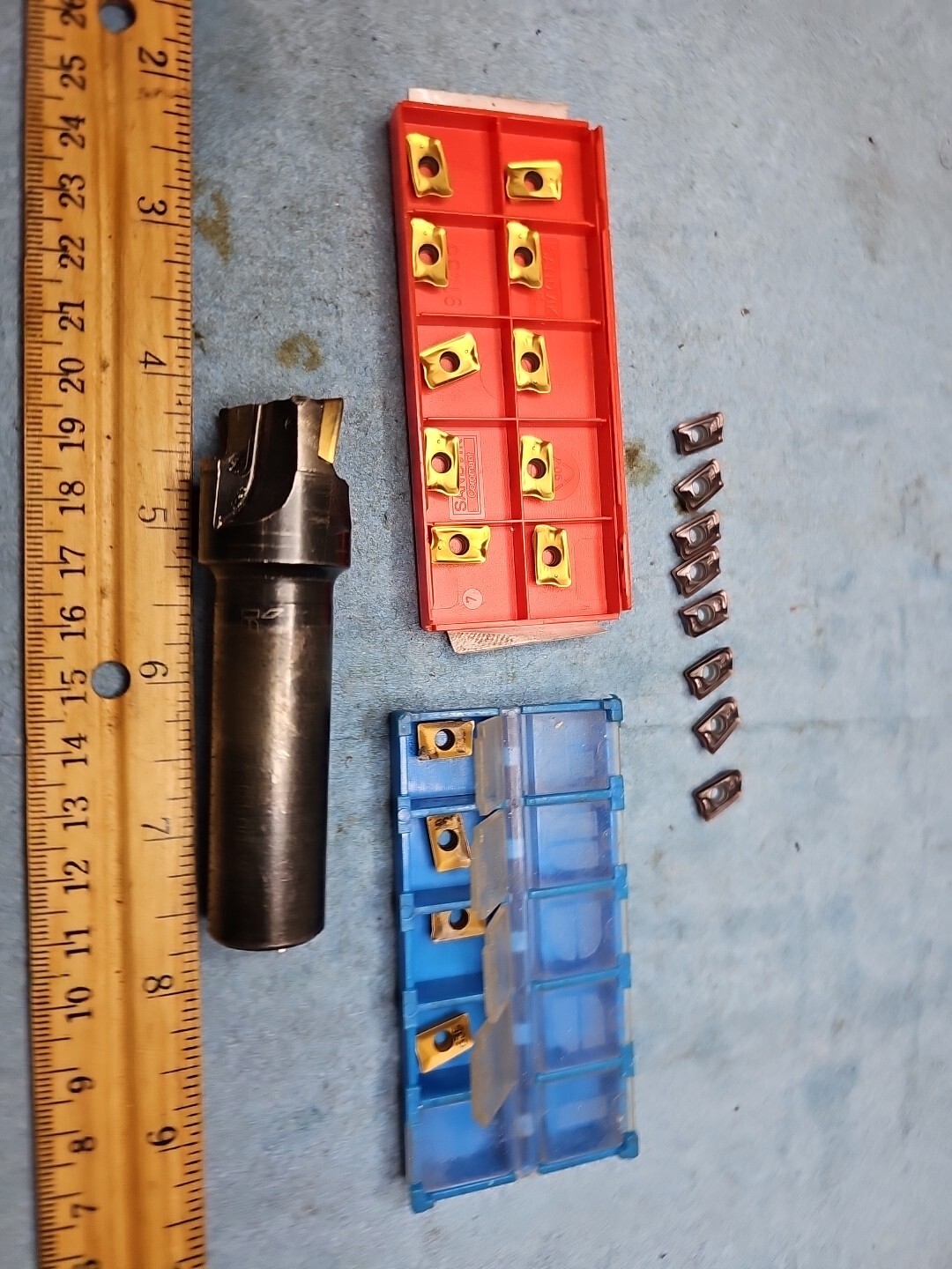 INCLUDES 10 NEW SANDVIK R390-11 T3 08M-PL GRADE 1025 CARBIDE INSERTS 4 NEW ISCAR APMM 1003 PD-R 635 CARBIDE INSERTS 8 NEW CARBIDE INSERTS MFG UNKNOWN ALL INSERT SCREWS HAVE BEEN LOOSENED AND RETIGHTENED AND ARE IN EXCELLENT WORKING CONDITION This modified ISCAR indexable end mill is a must-have for your metalworking supplies. With a 1-inch cutting diameter and a 3/4-inch shank diameter, it is perfect for your CNC machines. The 2 flute design and 22 new inserts make it a great addition to your tool box The brand ISCAR is known for their high-quality tools and this end mill is no exception. Whether you're finishing off a project or creating a new one, this indexable end mill will help you achieve the desired results. Don't miss out on the opportunity to add this versatile tool to your arsenal.