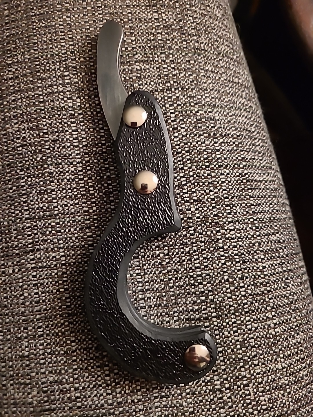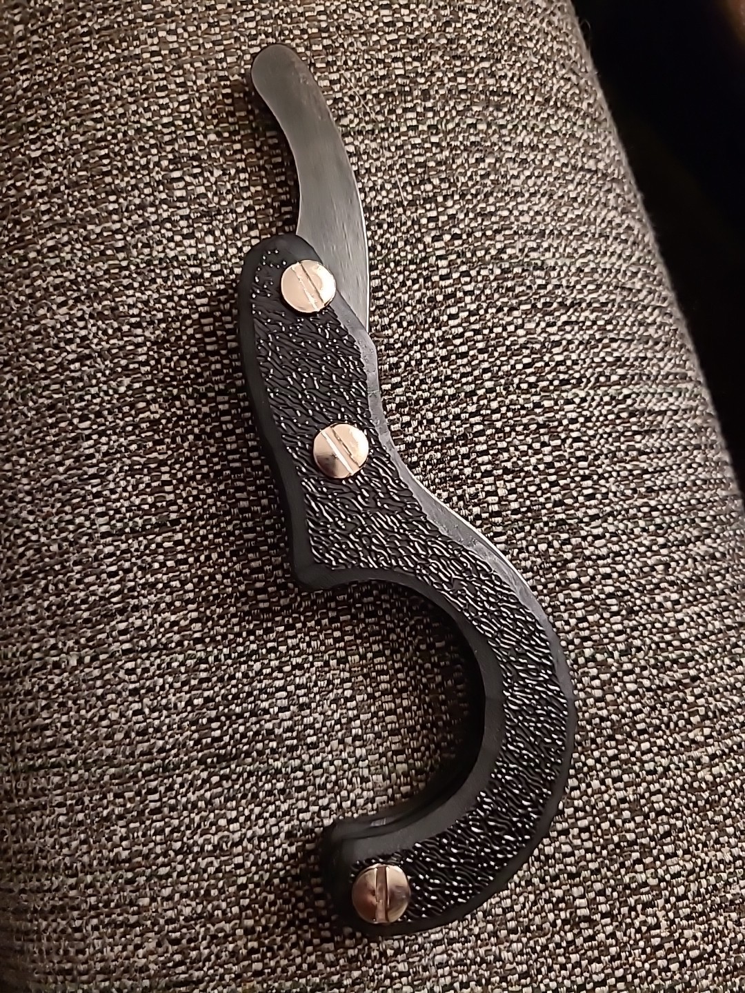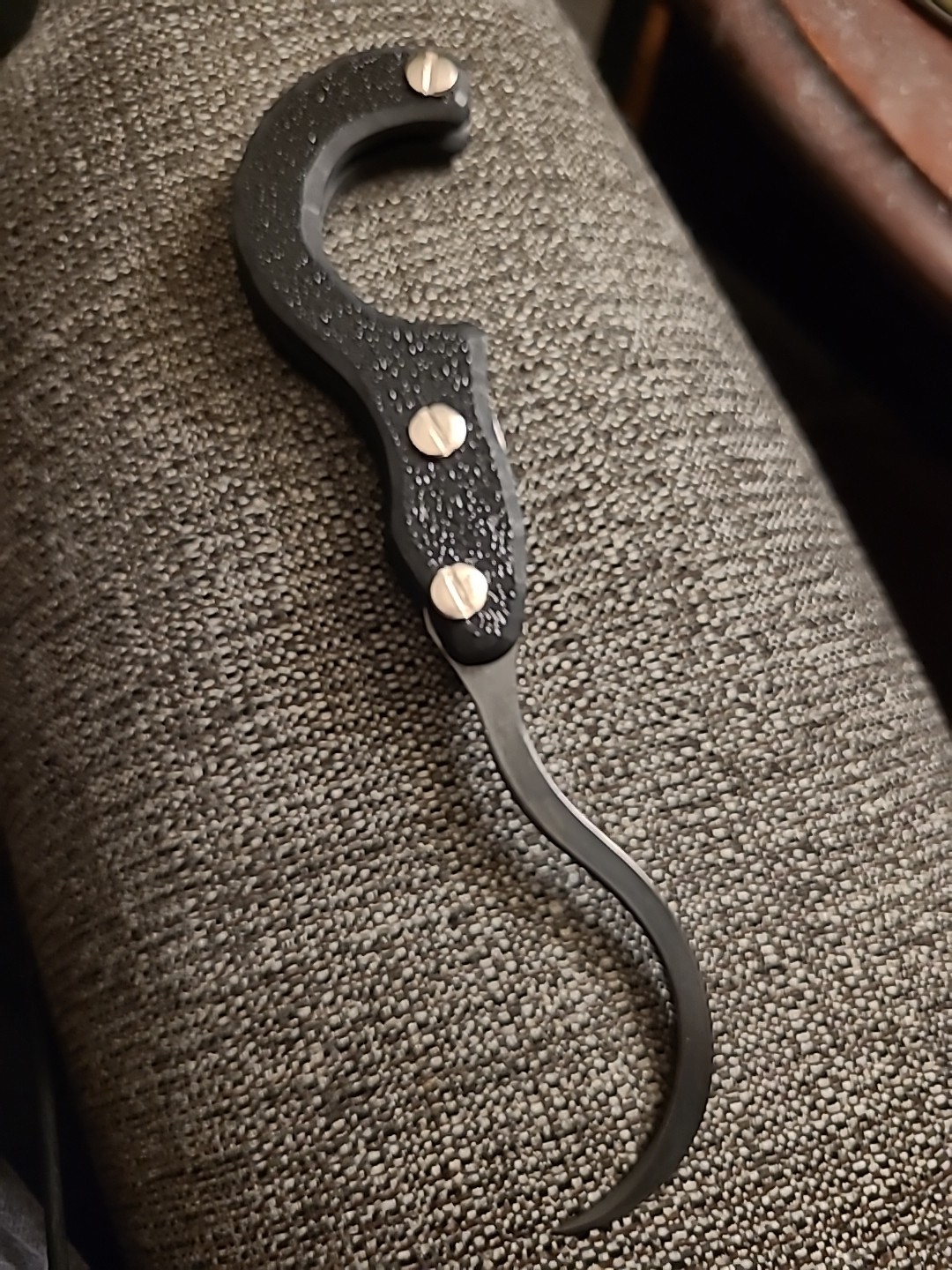 Handmade in the USA by RcaneArtisan. 3 1/2" long hook made from 3/32" thick 1095 high carbon steel. Sharp point. No edges. Cold blue finish. 1/4" thick textured black plastic handle scales. Nickel silver Chicago screws. Kydex spacer. 6 1/2" closed. 8 1/2" opened.