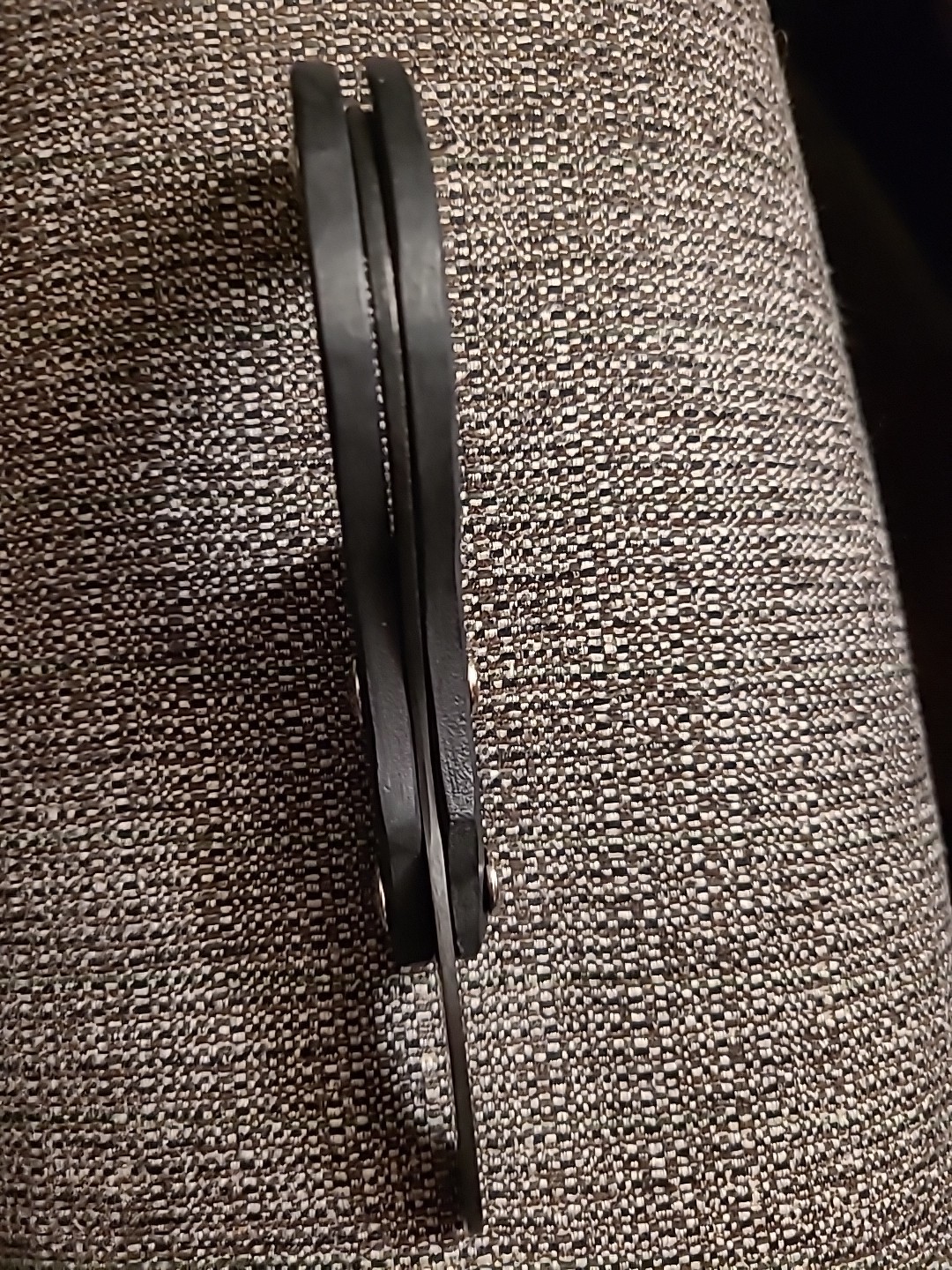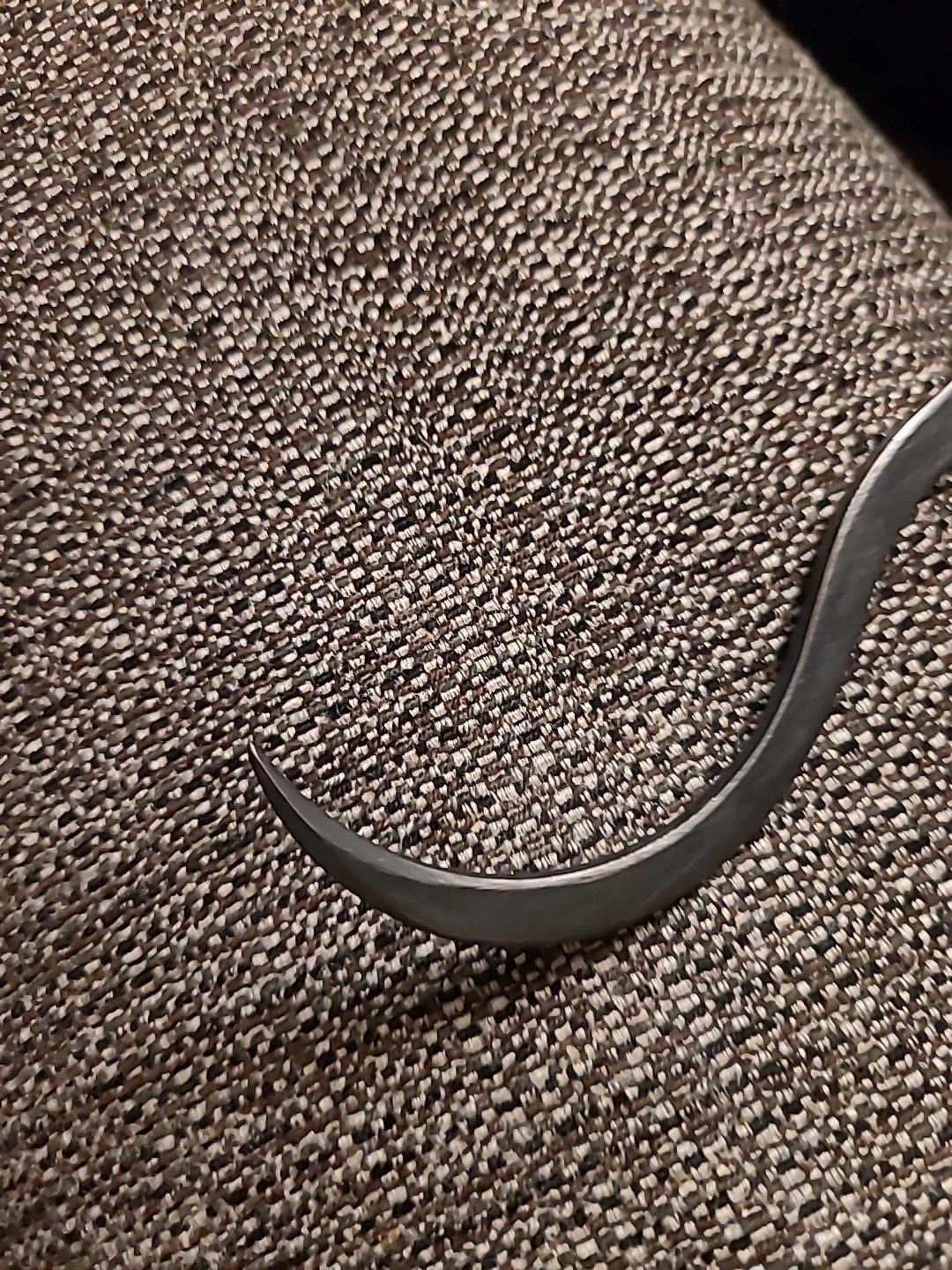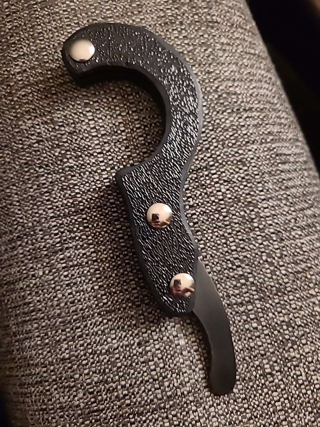 Handmade in the USA by RcaneArtisan. 3 1/2" long hook made from 3/32" thick 1095 high carbon steel. Sharp point. No edges. Cold blue finish. 1/4" thick textured black plastic handle scales. Nickel silver Chicago screws. Kydex spacer. 6 1/2" closed. 8 1/2" opened.