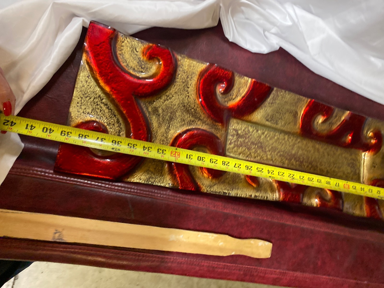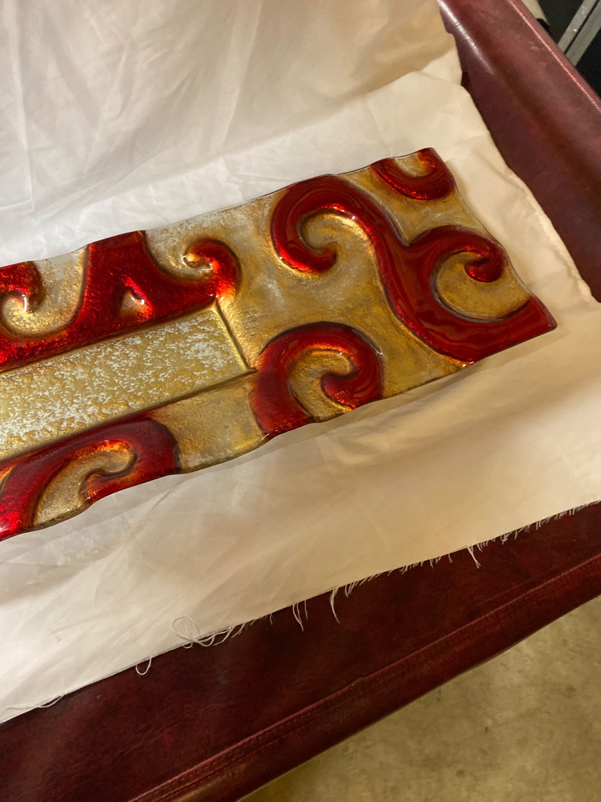 Modern Art Glass Serving Tray Elongated Center Piece Red Gold Iridescent Modern Art Glass Decorative Serving Tray Glass. iridescent red and gold embossed swirl design.This is an elongated Glass Tray with remarkable designs and a beautiful and elegant look. It weighs 12 pounds and measures 39” long by 10” wide by 2" tall. This abstract glass tray is in very good condition with no breaks or Chips or cracks.This will be packed up very safely for shipping.Please message with your Zip for more accurate shipping costs.Please look at the photos, as they are part of the description. Thank you.