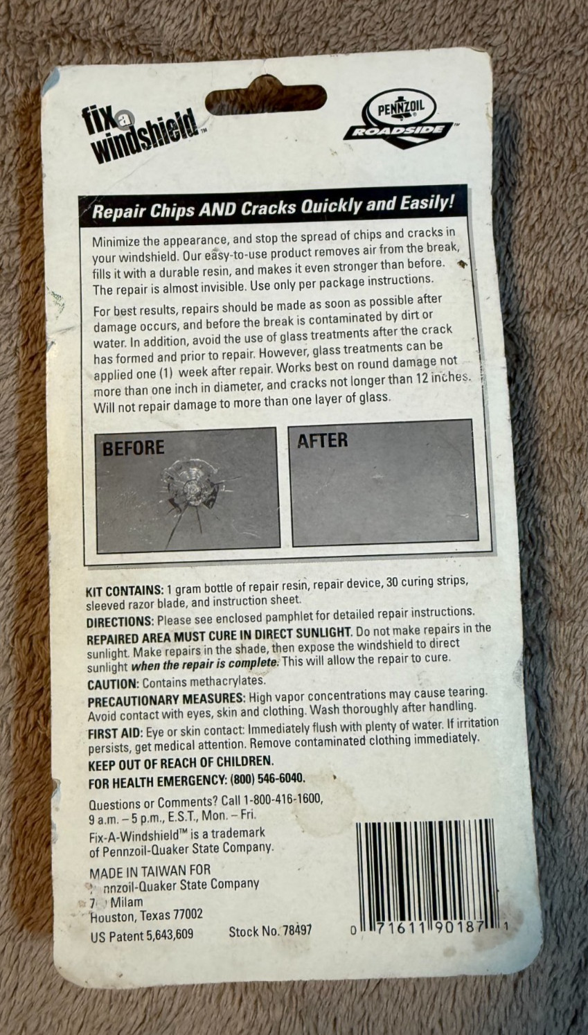 Pennzoil Fix a Windshield Kit Vintage DIY Windshield Repair, New