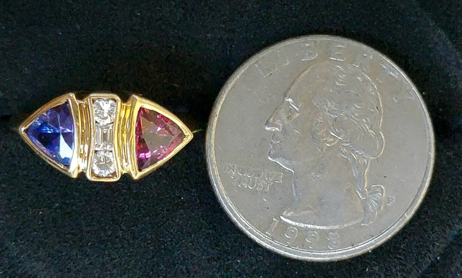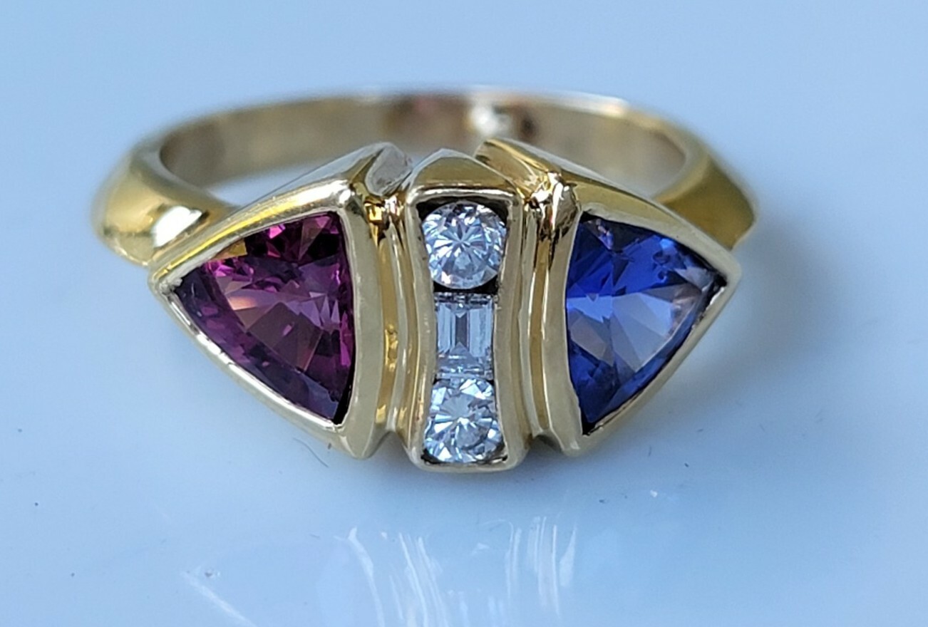 14k Yellow Gold Tanzanite Pink Garnet Diamond Ring The tanzanite is approx 1cts The garnet is approx 1ct The diamonds are approx Size is approx 6.25 see pic Weight approx 7.6gm This is a stunning ring. Although I have this ring listed at 14k it has been X-ray tested to be 16k gold by my jeweler Please look at all 12 pics as they are part of the description. All pics enlarged to show details Disclaimer : Because of different gold testing practices (acid, electronic and x ray), items stamped 14k may read or actually be between 13.5k-15k gold. Until 1981, manufactures of jewelry could use gold that was 13.5karat or higher and round off, thus still stamping it 14k.This goes for 18k gold also. See National Gold and Silver Marking Act of 1981. Most of the items I sell are vintage or antique. They have had a previous life. You might find some minor imperfections or flaws. This is to be expected and adds to the individual character of the item. Please view all of the pictures as they are an important part of my description. The pictures give a better description than any words. So zoom over each picture. What you see is exactly what you get. Keep in mind ALL pictures enlarged to show details. Use a ruler to measure! I take many pictures and I try to be as accurate as possible in my description. I am not an expert but I will guarantee the item to be as described. If you have a problem with any item, please contact me. I will try to resolve any issues you have without a hassle. I will be happy to answer any questions or provide additional pictures upon request. I have been a reputable eBay seller for many years. Please check my feedback rating and bid with confidence. AGAIN ALL MY PICTURES ARE ENLARGED TO EBAY'S STANDARDS TO SHOW DETAILS. IT IS THE BUYERS RESPONSIBILITY TO USE A RULER TO MEASURE OR REQUEST ADDITIONAL PICTURES