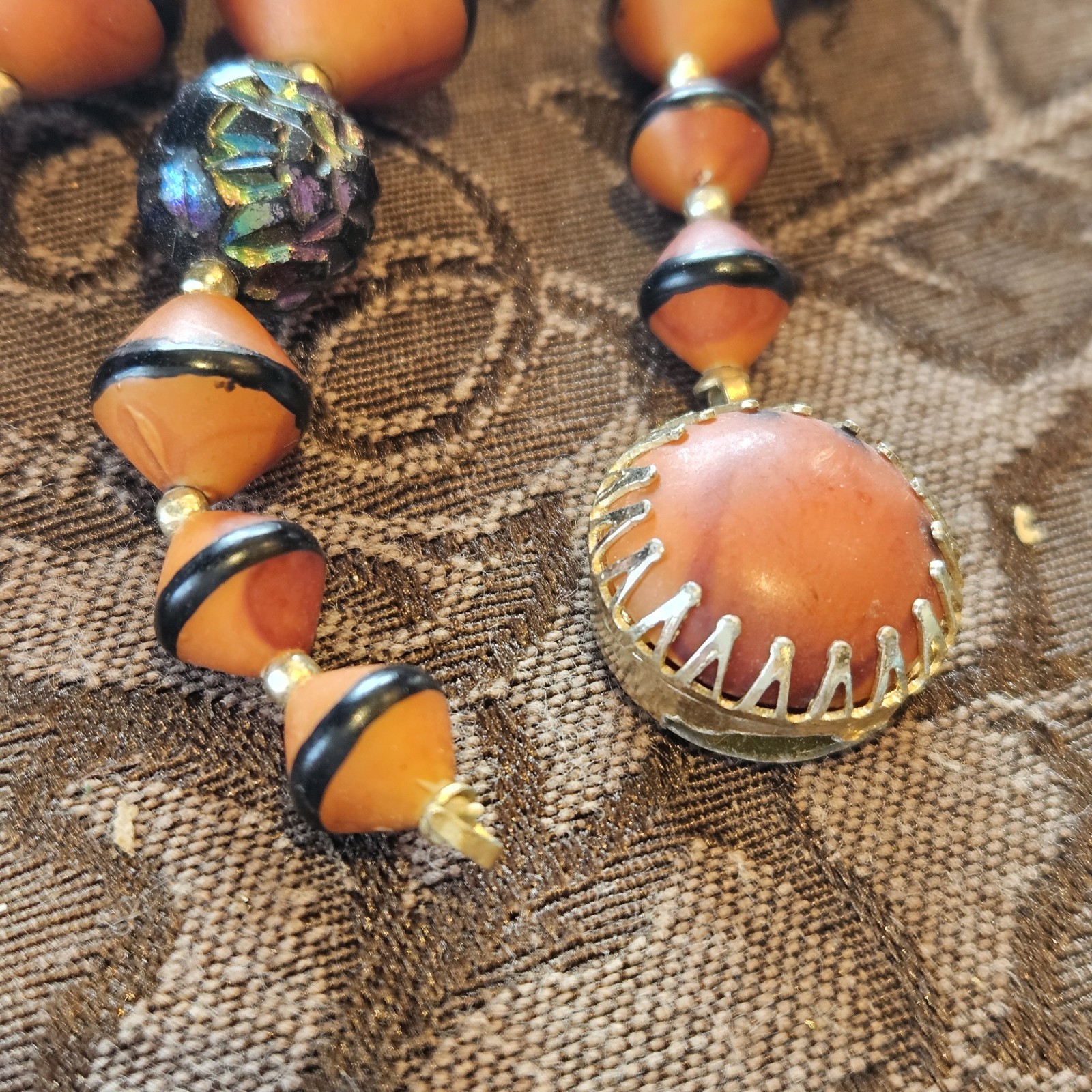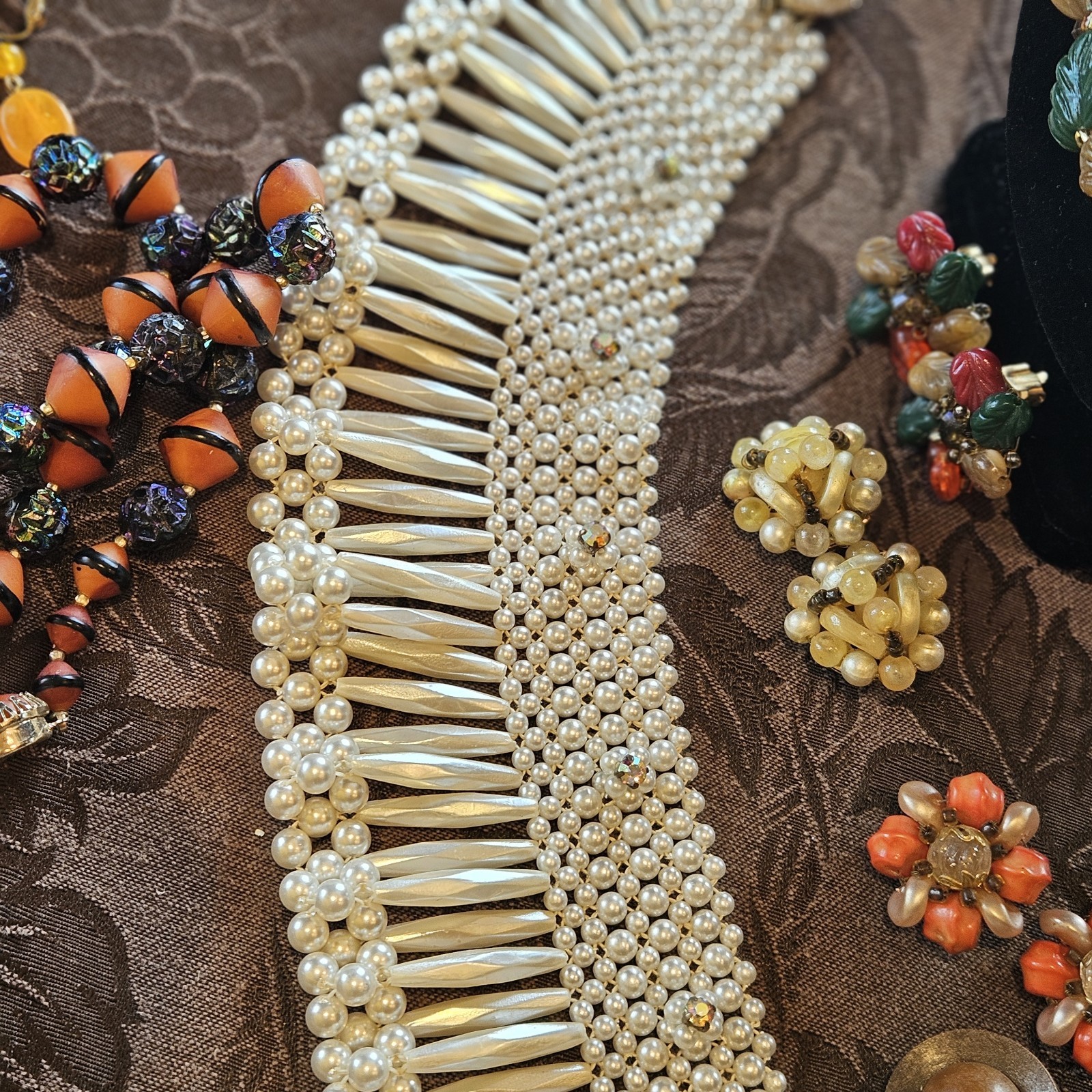 Lot of 12 Vintage Estate Jewelry marked Hong Kong. 5 necklaces, 6 pair of clip Earrings, 1 Beaded collar. Orange and Blue necklace missing end clip. Beaded collar also missing end clip. See photo's.