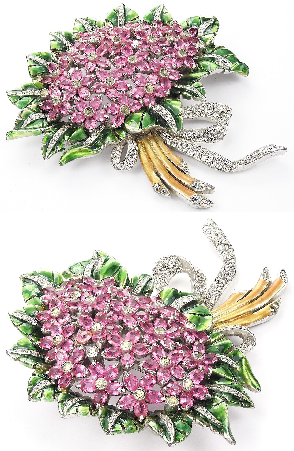 img We are N&N Vintage Costume Jewelry Online and on eBay since 1999 Dujay Pave and Metallic Enamel Giant Floral Posy of Five Petalled Pink Topaz Flowers and Leaves Pin Description: rhodium plated base metal, rhinestones, enamelling Marked: unsigned Reference: Design, construction, and non-use of Sterling date this to 1938-42. The five petalled flowers feature in many Dujay pieces - see DUJ423 and references there Condition: Excellent Size: 3.45" x 3.125" N&N specializes in the classic period from the 1920s to the 1970s, when great designers - some trained in the fine jewelry houses of Paris - created the most magnificent costume jewelry ever seen - when jewels of glass and base metal rivalled artistically those made with precious stones. With thousands of items for sale, you can always find gorgeous additions to your collection.Online and on eBay since 1999, you can buy from N&N in confidence that we guarantee your items to be authentic, as dated, and as photographed and described.