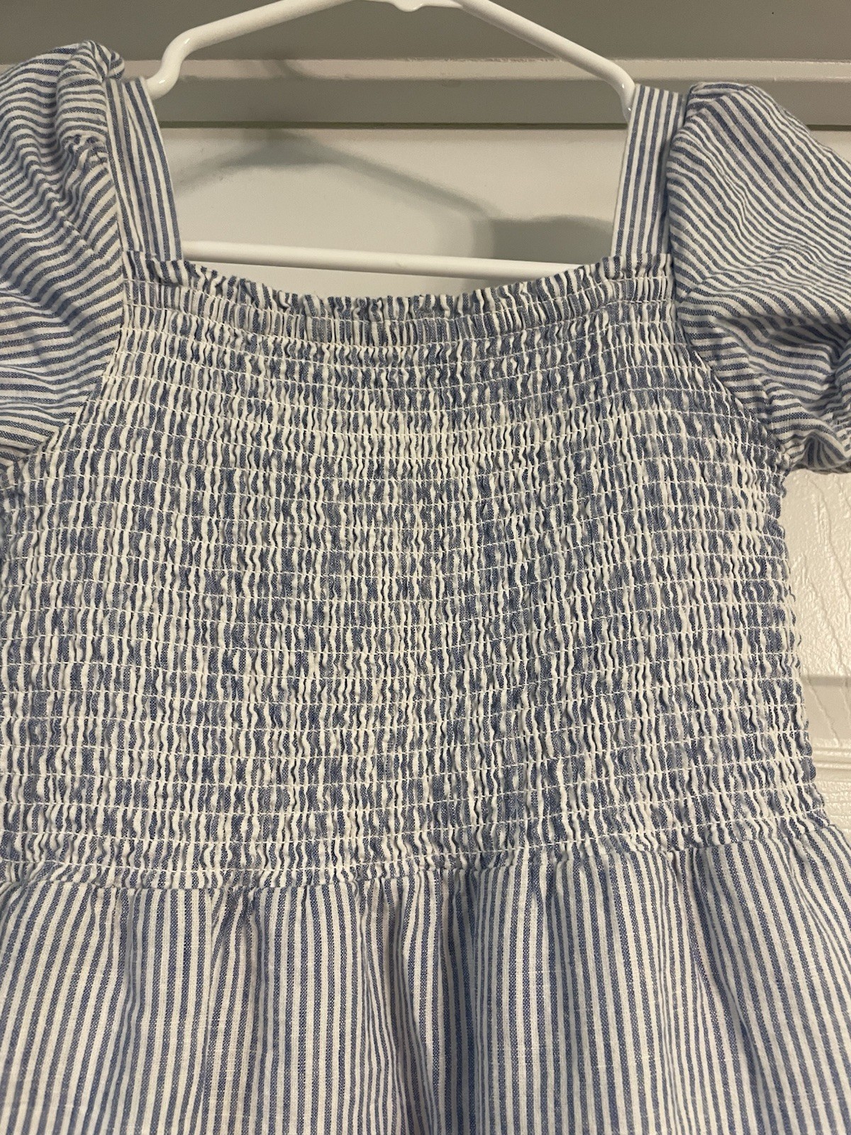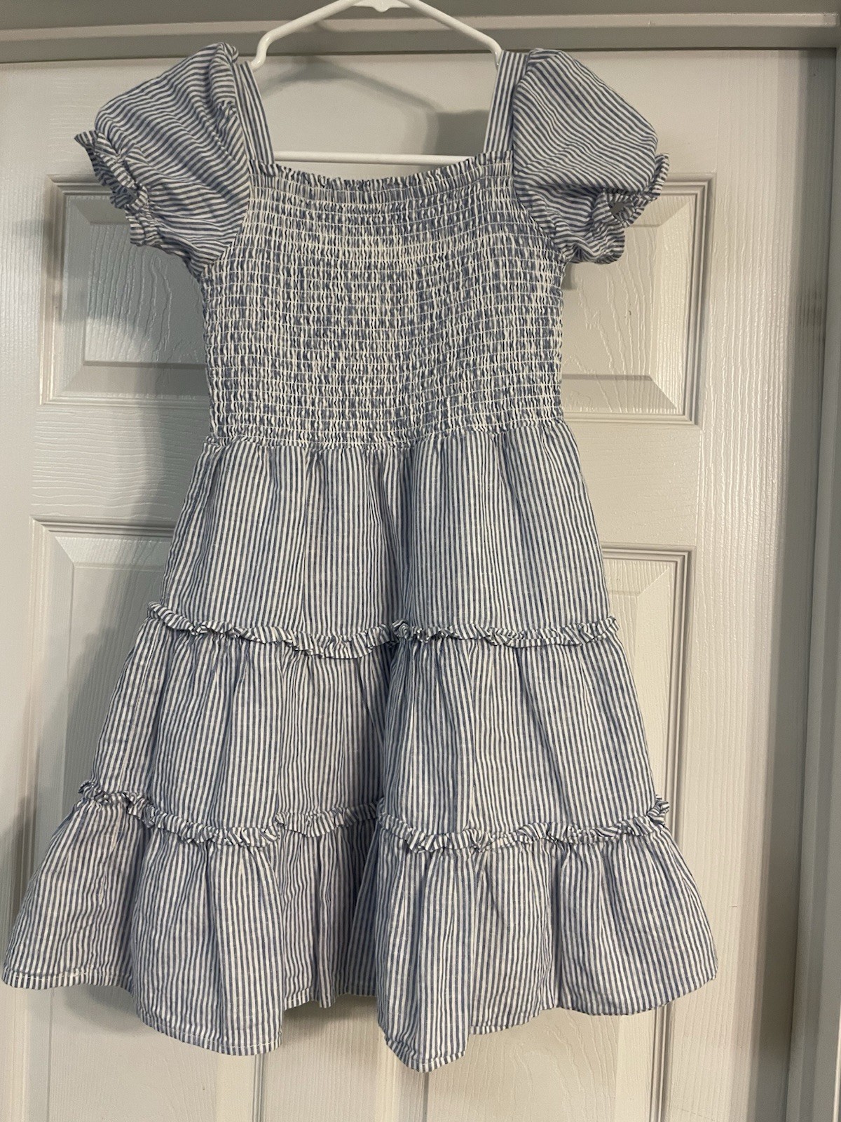 Gymboree Girls Short Sleeve Blue and White Smocked Striped Linen Dress, Size 10