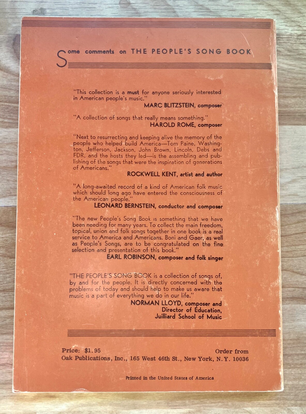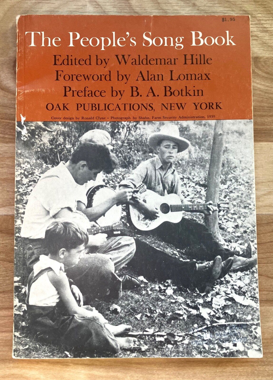 Welcome to my listing for The People's Song Book, a historic collection of folk songs edited by Waldemar Hille with the help of Alan Lomax, Pete Seeger and others, that had a huge influence on the New York folk music scene in which Bob Dylan became famous . This is the 128-page softcover Eighth Printing from 1964, published by Oak Publications. It is gently worn, clean solid and usable. The pages are lightly yellowed, but undamaged and unmarked and uncreased. The covers have light handling wear but no major creases.