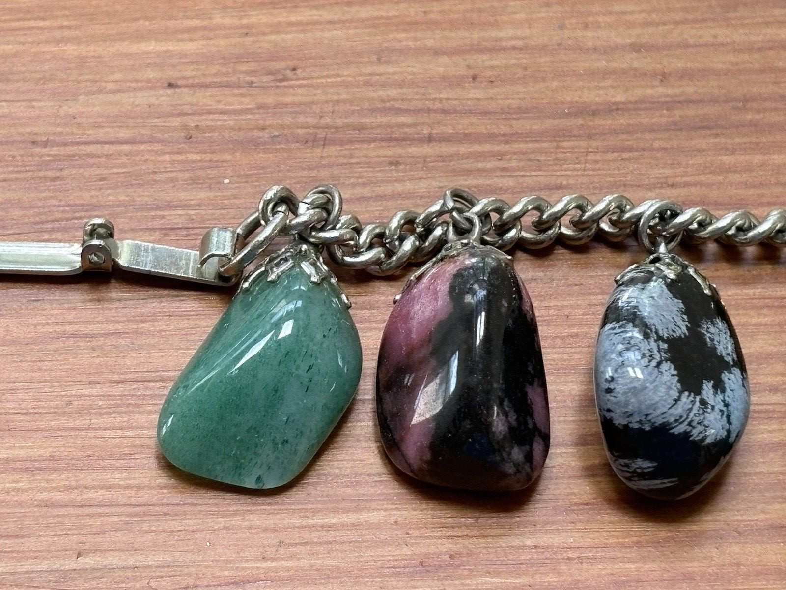 Silver Tone polished 9 Stone Charm Bracelet Aventurine, Amethyst, others 6 1/2" Specs