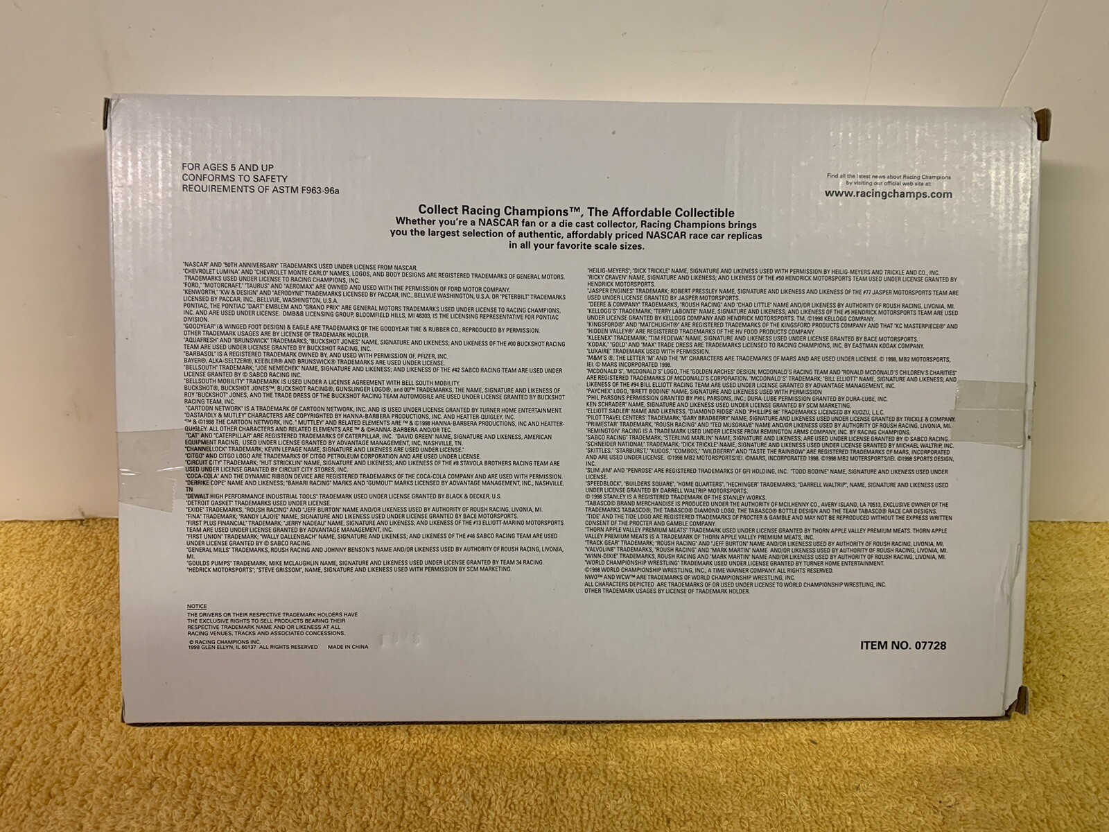 Brand New, Only removed from box for photos. Includes Certificate of Authenticity.1998 RACING CHAMPIONS 1/64 WORLD CHAMPIONSHIP WRESTLING WCW12 PIECE DIECAST CAR SET WITH WOODEN DISPLAY 1/250012 CARS, 1 - Gold WCW AND 11 DEPICTING WRESTLERS GIANT, HOLLYWOOD HOGAN, KEVIN NASH, STING, RANDY SAVAGE, SCOTT HALL, GOLDBERG, BRET HART, RAVEN, LEX LUGAR & DIAMOND DALLAS PAGE.PROMOTION WAS USED TO PROMOTE THE 1998 PAY PER VIEW EVENTS:SOULED OUT 1/24/98 WASN'T PROMOTED SINCE NASCAR DOESN'T START TILL FEBRUARYSUPERBRAWL VIII 2/22/98UNSENSORED 3/15/98SPRING STAMPEED 4/19/98SLAMBOREE 5/17/98GREAT AMERICAN BASH 6/14/98BASH AT THE BEACH 7/12/98ROAD WILD 8/8/98FALL BRAWLHALLOWEEN HAVOC 10/25/98WORLD WAR III 11/22/98STARCADE 12/27/98