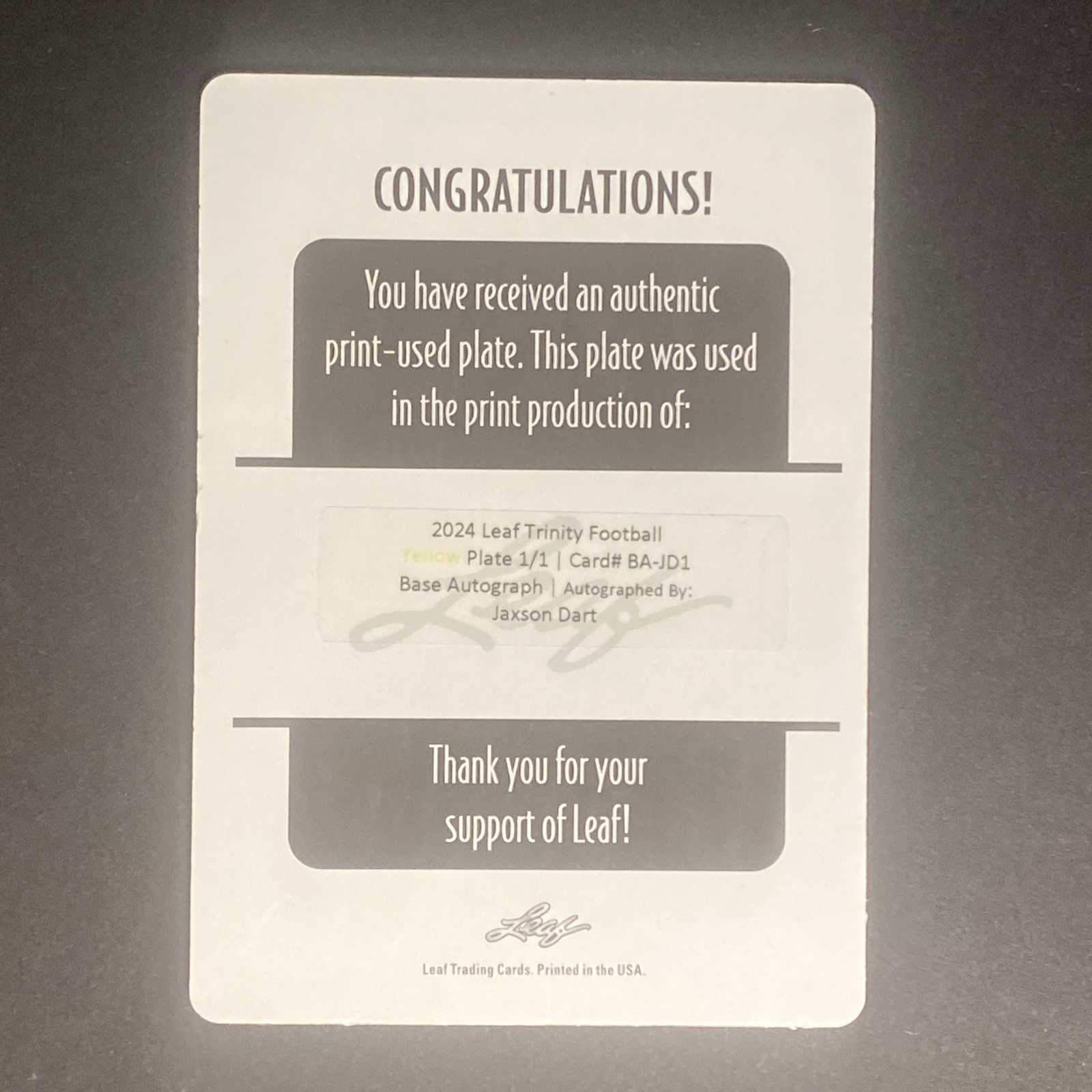 Jaxson Dart 2024 Leaf Trinity Yellow Printing Plate Auto 1/1 Giants QB 🔥🔥🔥