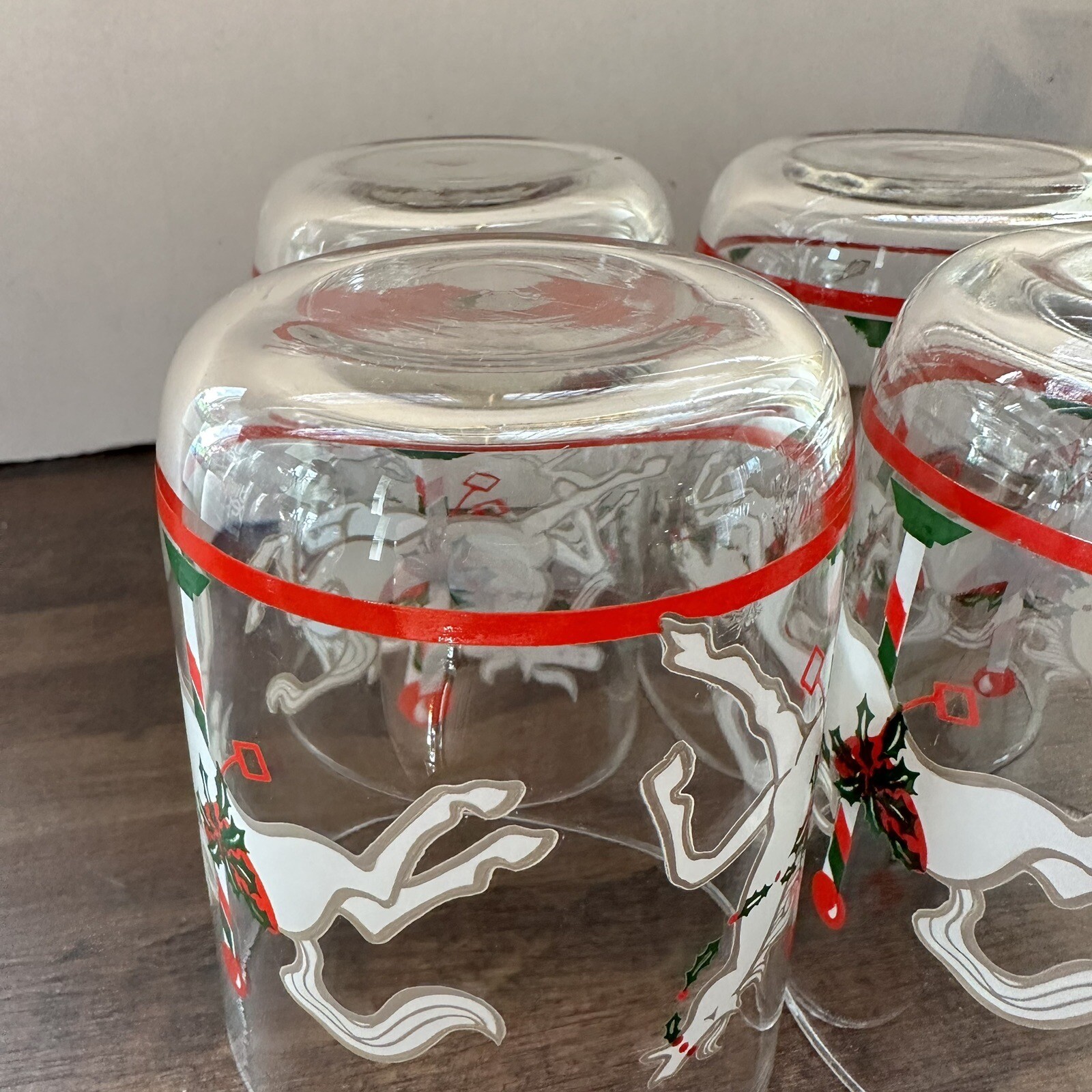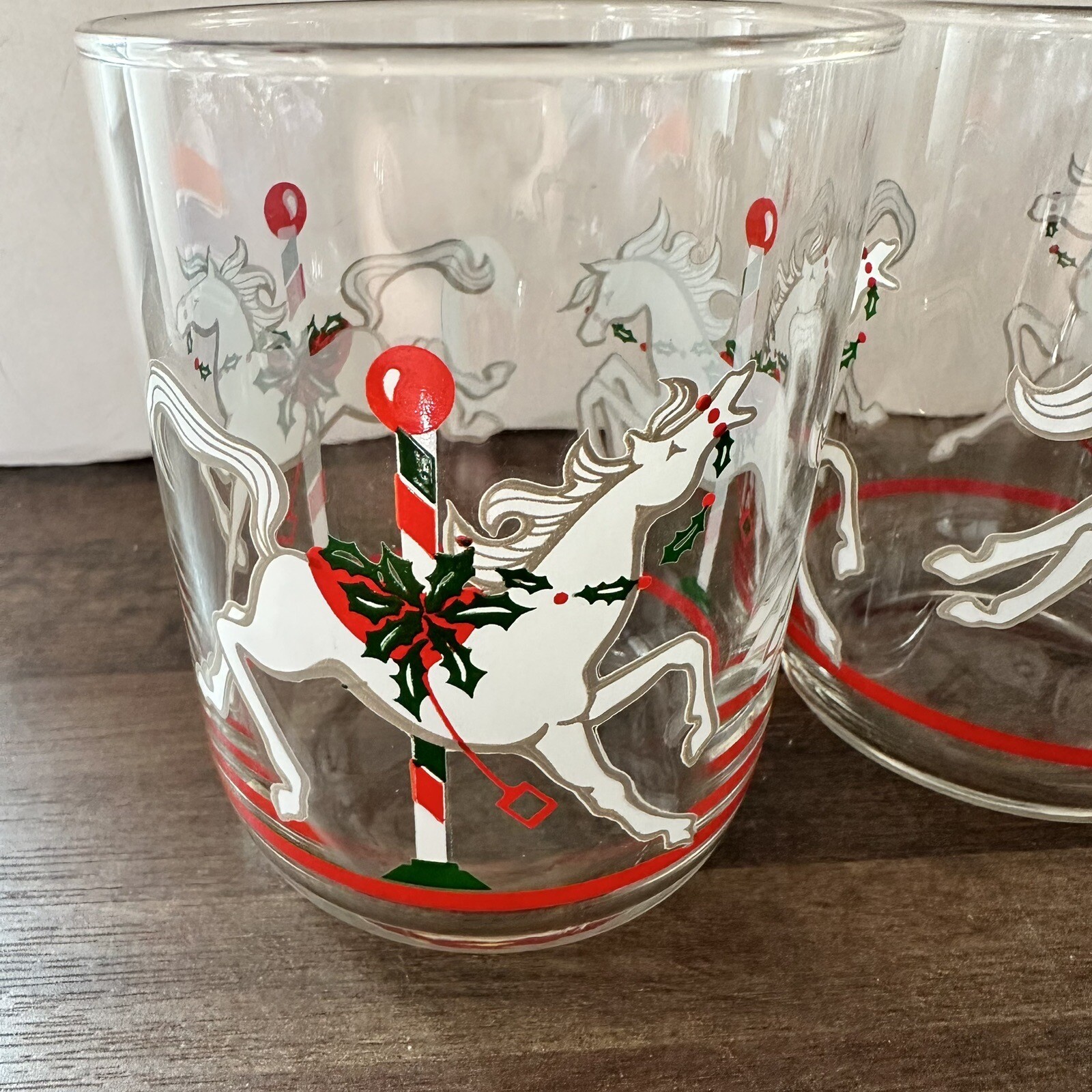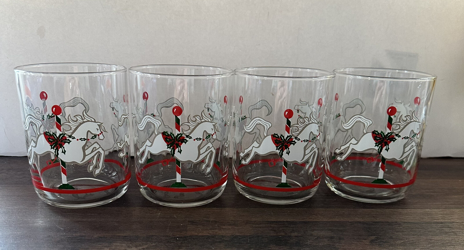 Vintage Set of 4 Libbey Christmas Carousel Horse Glass Tumblers White, Red Green
