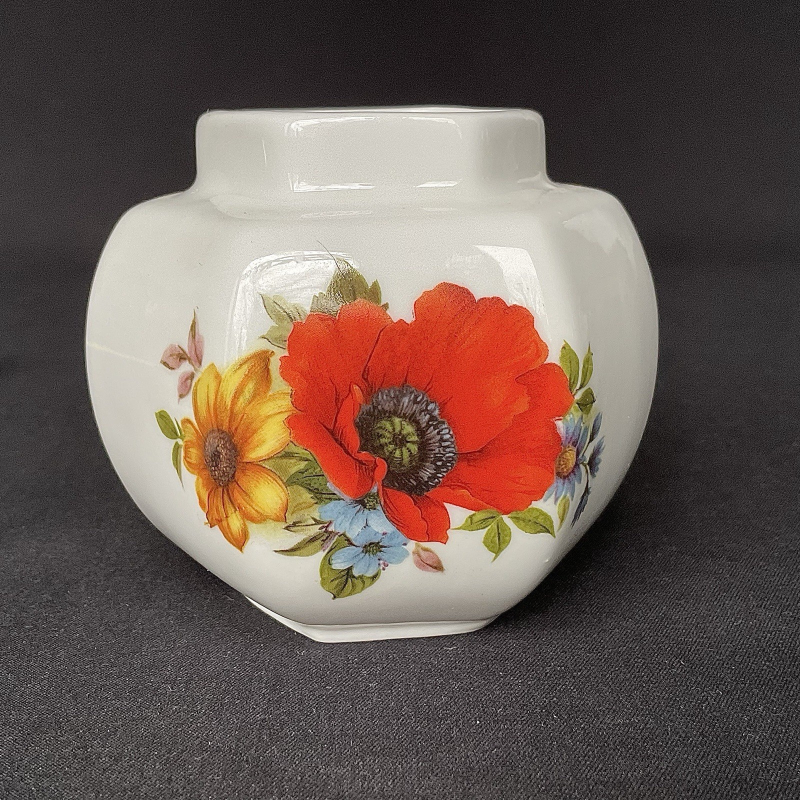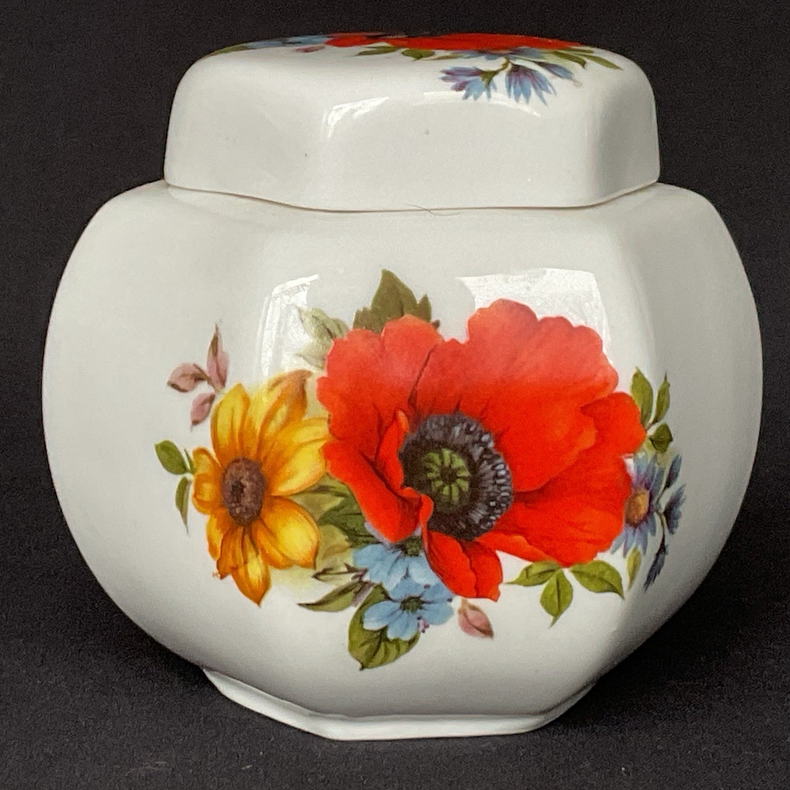 Bone China England Lidded Jar 3" Hexagon Floral Orange Yellow Collectible