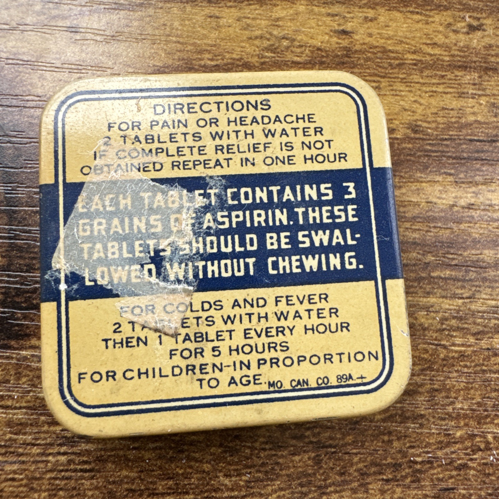 With original directions-fun to read!! Bro-asprin to the rescue with no disagreeable after affects. 😆 This tin still had the aspirin inside but I discarded them. Directions are very fragile with age. Tin measuring just under 2x2”