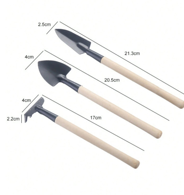 Product Details · Complete 3-Piece Gardening Kit Includes a small shovel, rake, and trowel—perfect for planting, weeding, and maintaining indoor or outdoor plants. · Ideal for Potted Plants and Succulents Specially designed for delicate gardening tasks like repotting succulents, bonsai, herbs, and flowers. · Durable and Rust-Resistant Materials Made with high-quality metal and sturdy wooden handles that ensure long-lasting use and resistance to wear. · Lightweight and Easy to Handle Compact design makes them easy to maneuver, especially for small pots and tight spaces. · Ergonomic Wooden Handles Smooth and comfortable handles provide a secure grip, reducing hand fatigue during long gardening sessions. · Perfect for Home and Balcony Gardening Great for urban gardeners, balconies, or small outdoor spaces where precision tools are essential. · Compact and Easy to Store Small
