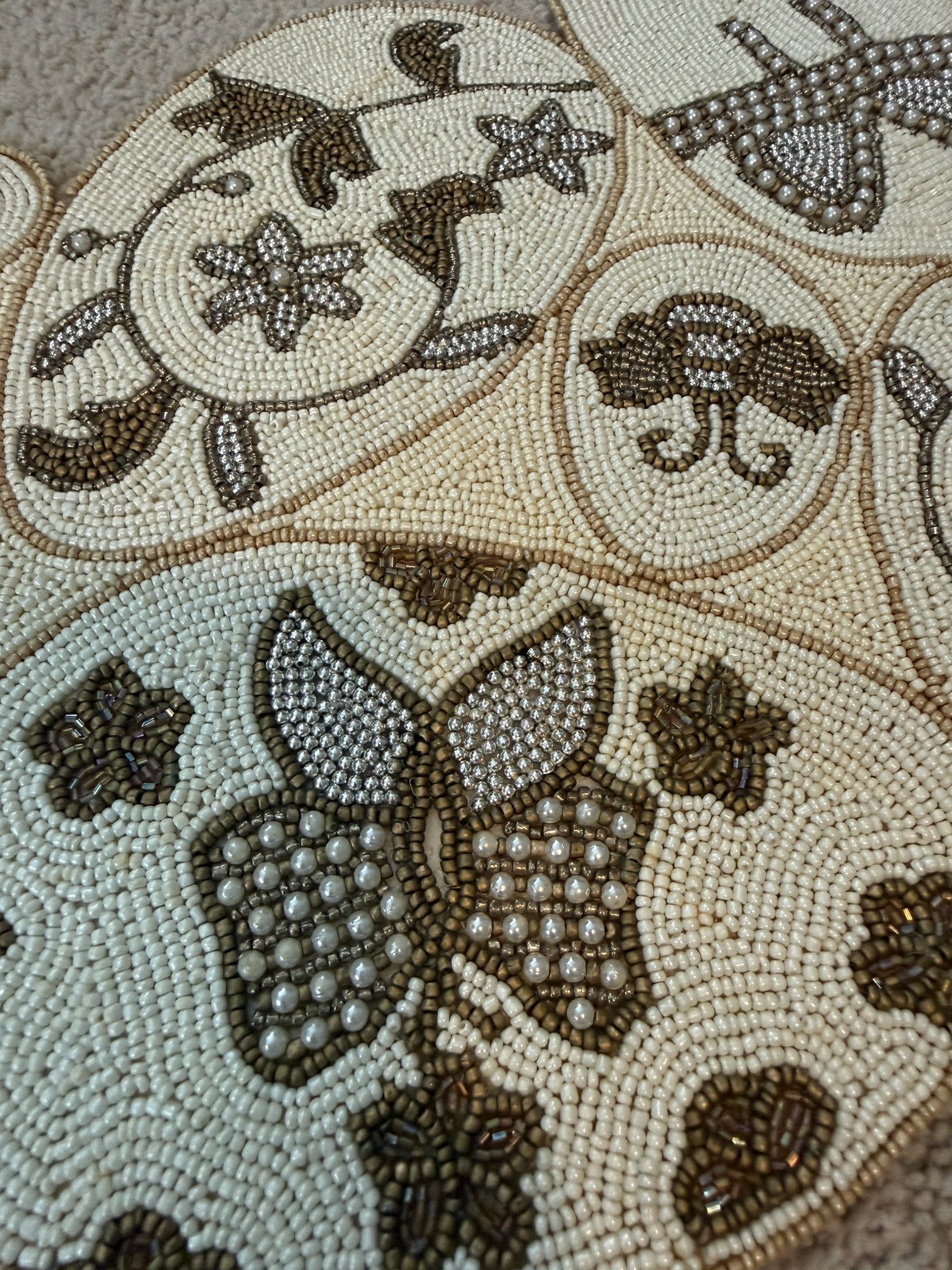 The Pier 1 Gold & Cream Beads & Faux Pearl Easter Eggs Table Runner is a stylish and festive addition to your dining table. This oblong table runner features a beaded design with hues of gold and cream, perfect for celebrating Easter and the spring holiday season. Made with faux pearls, glass, and acrylic beads, this 36" table runner from Pier 1 Imports adds a touch of elegance to your home decor. Discoloration of silk on back side due to water spot cleaning. A few beads missing near the edge of one egg. No returns. No international shipping.