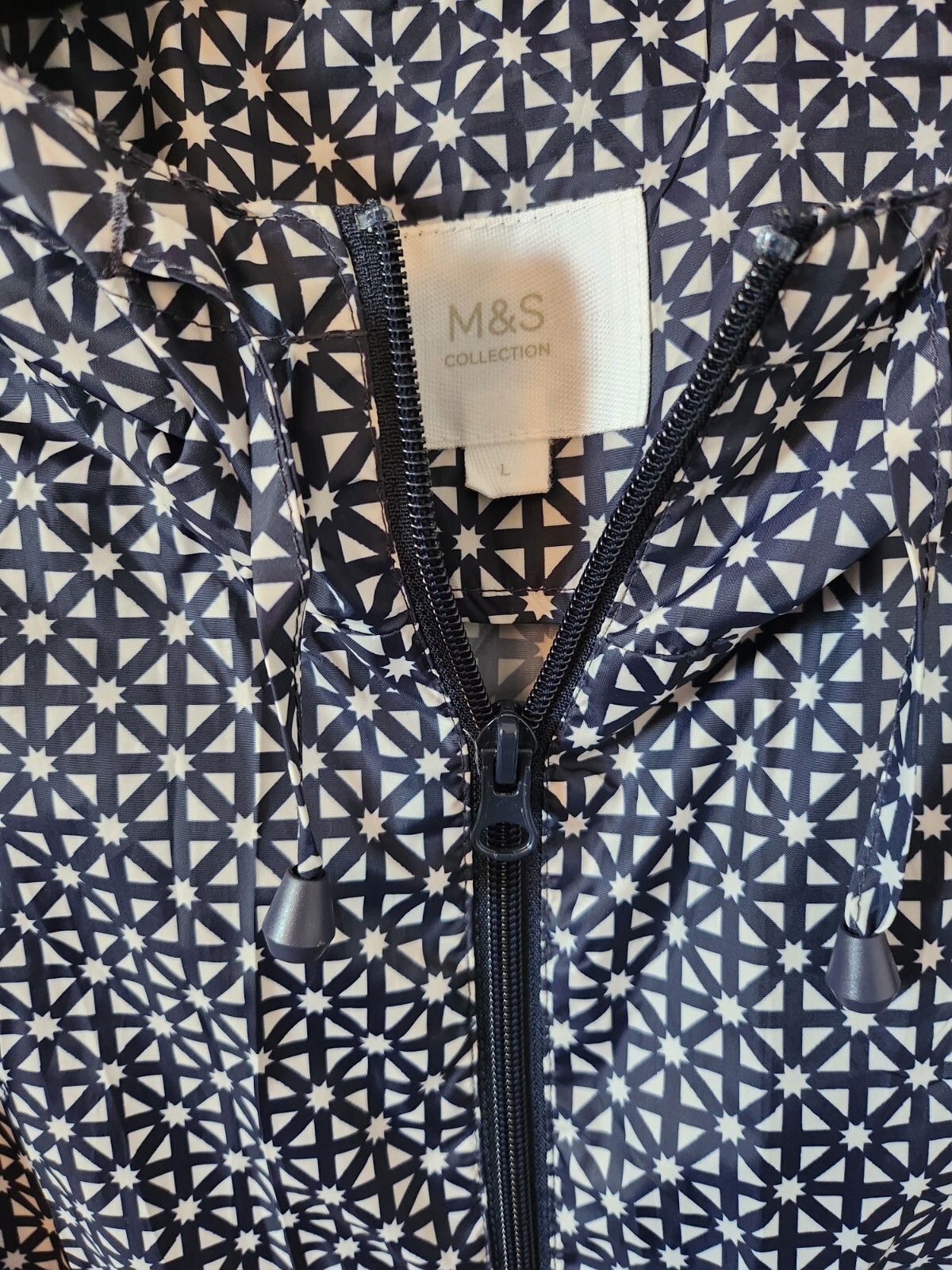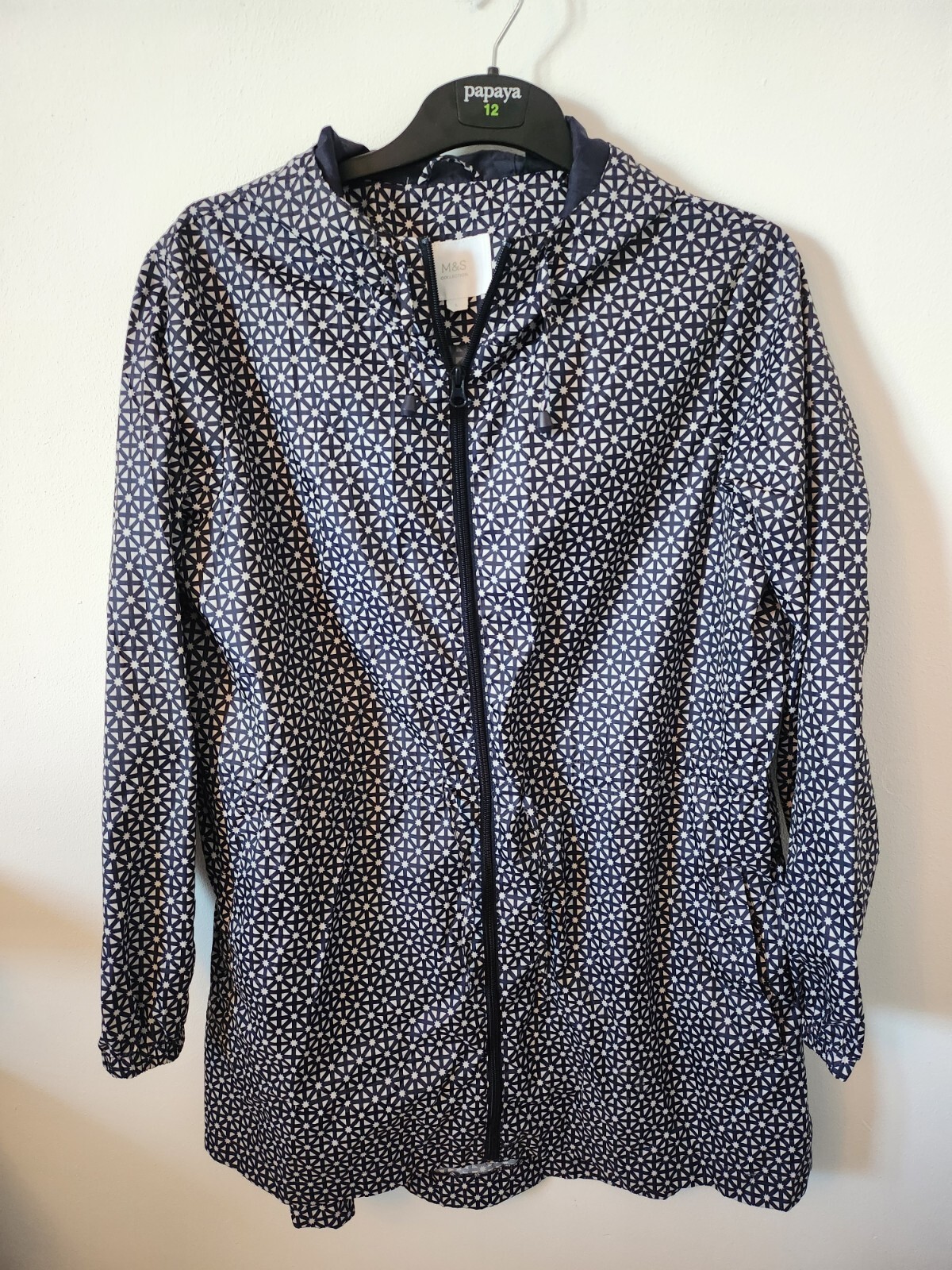 Marks And Spencers Ladies Rain Coat Size Large (14-16) Navy and White Hooded