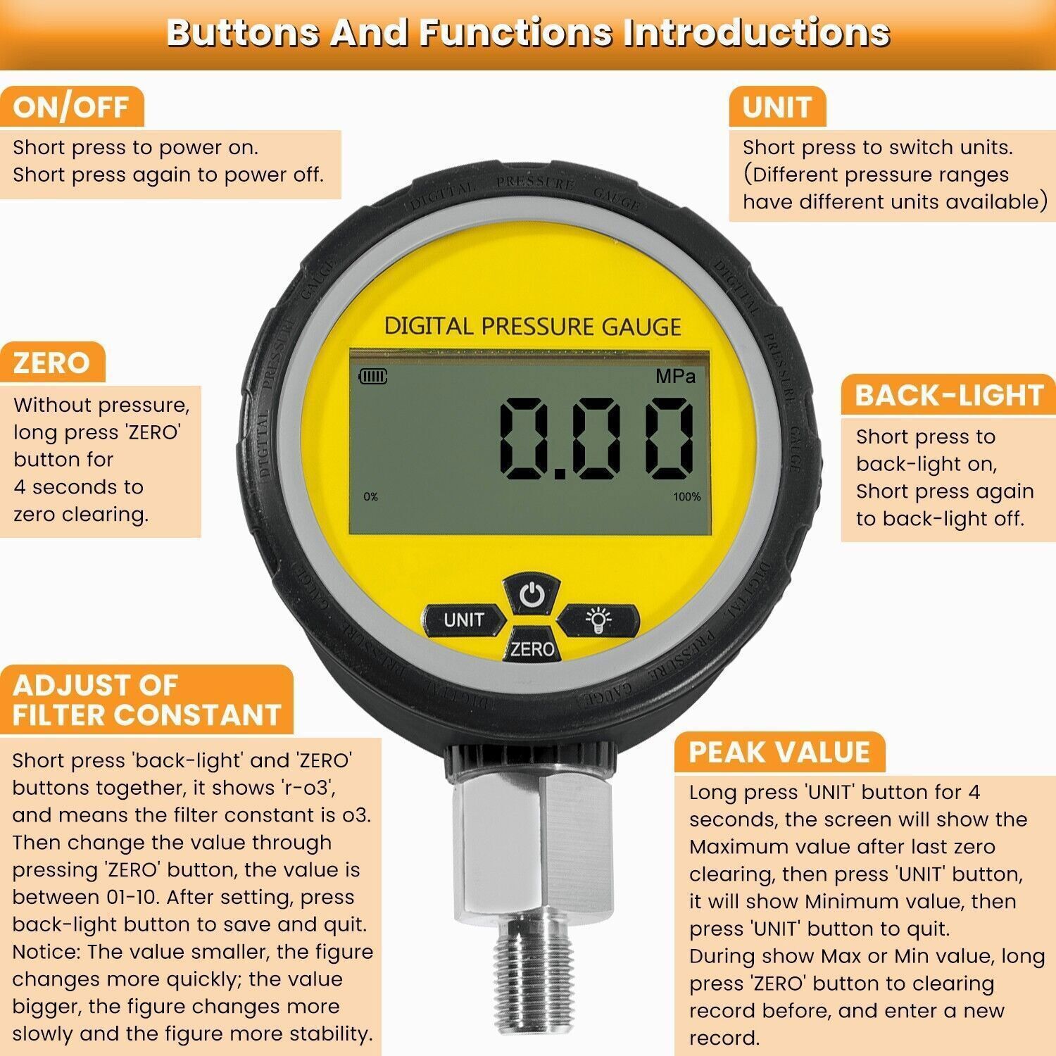 size LCD. The pressure gauge has various features, such as zero clearing, a backlight, an on/off button, units, and a low voltage alarm. And it is convenient to install and easy to operate. Its max work pressure:10000PSI/700BAR/70MPa 2) 4-digit LCD screen, the hydraulic pressure gauge with clear LCD display design, clear number markings for convenient and easy readings. (display Unit: Bar, PSI ,MPa, Kgf/cm2) 3) This hydraulic pressure gauge tester is made of quality 304 stainless steel, and with gauge protector cover, that is corrosion-resistant, rust-resistant to keep a new looking and durable 4) This is an essential tool for pressure measurement, equipment supporting, equipment calibrations, etc. It is flexible use, simple operation, easy debugging, safety and reliability. Allows connection to standard test ports on most USA, Japanese and European brand excavator construction machinery 5) 1 x Intelligent Digital Pressure Gauges: 0-700BAR/10000PSI/70Mpa and 1 x Silcon Rubber Protector | Connection Thread: NPT1/4 male | Display Unit: Bar, PSI, MPa, Kgf/cm2; Overload Capacity: 150% | Accuracy: 0.2%FS | Long-term Stability: 0.2%FS/year | Working Temperature: -20C-70C | Input Voltage: 3V (two 1.5V AAA batteries) | Function: On/off, zero clearing, units changing, backlight 6) If you're not 100% satisfied with our items, simply return it for a full refund in 30 days. Support 12 months’ Warranty. Package included:Digital Hydraulic Pressure Gauge PaymentShippingReturnsContact usPayment1. Payment methods accepted: Payoneer. Our Payoneer account allows you to pay by credit card, debit card and your paypal balance.2. All major credit cards are accepted through our secure payment processor Payoneer.3. We ship items to Your Ebay address.Please make sure your Ebay address is correct before you pay, cause it cannot be changed once the order shipped out.Shipping1. Item will be shipped out within 1-2 business day after clear payment received. 2. Please make sure shipping address on your Ebay account is correct & up-to-date. 3. All of our items are shipped from our US warehouse. 4. Please feel free to contact us by email if you cannot get your order in time. Please read the shipment and payment detail carefully before you bid.Returns1. Return to us within 60 days from the delivery date for exchange or refund. Refund will be given as Money back or item exchange (buyer's choice).2. Return shipping fee is the responsibility of buyer unless the return is a result of our mistake. 3. If you need return, please contact our customer service representative, let us know the detailed problem and send us some pictures for confirmation.Contact usPlease contact us via ebay using"Contact member". We will respond within 1 business day or less.Thank you for your understanding.