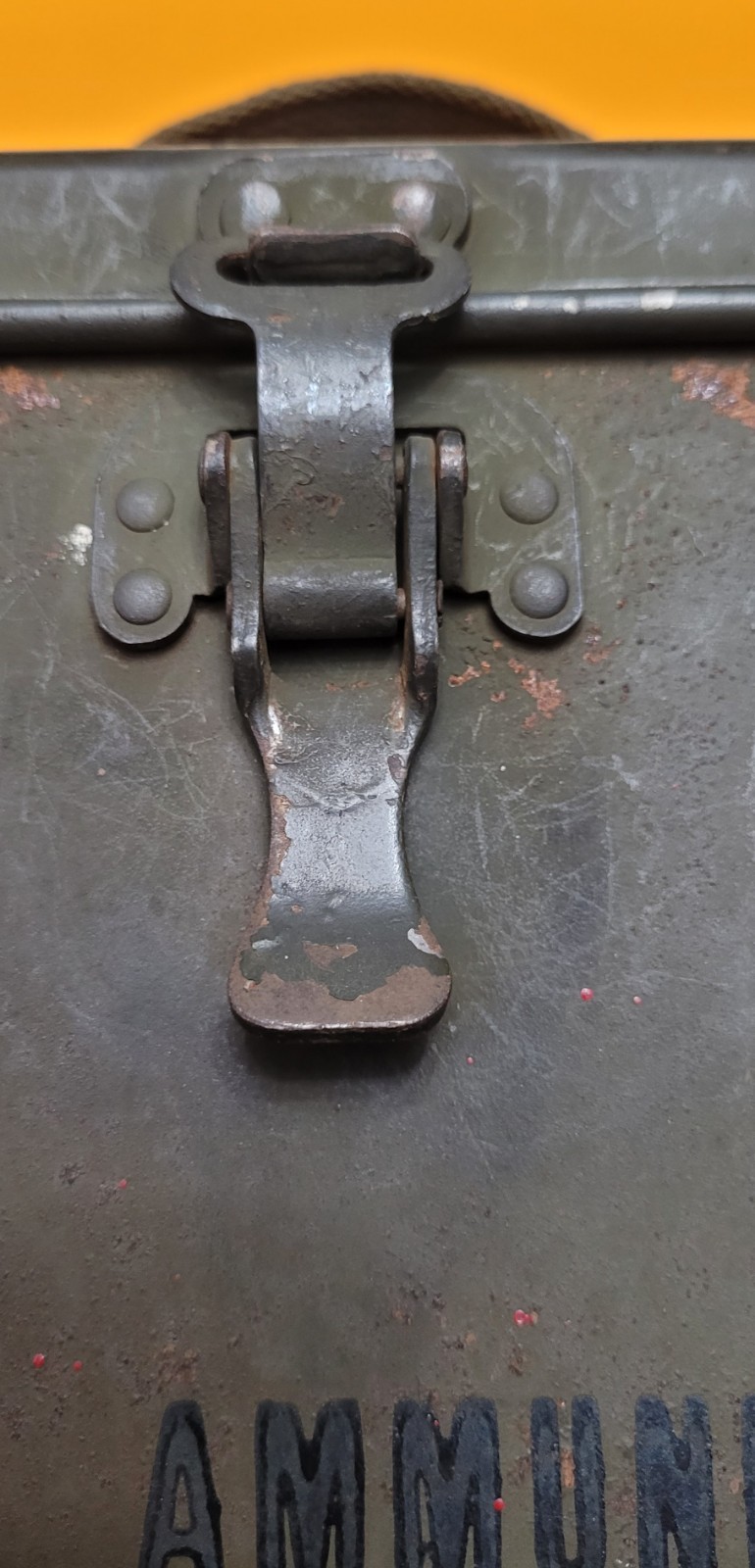 Ammo Chest, M17, 50 cal., D39091, cotton web handle, great overall condition with some paint loss and minor surface rust, some red paint spatter, latch operates properly. See photos for further details and ask any questions before bidding. Ships to 48 US States only.