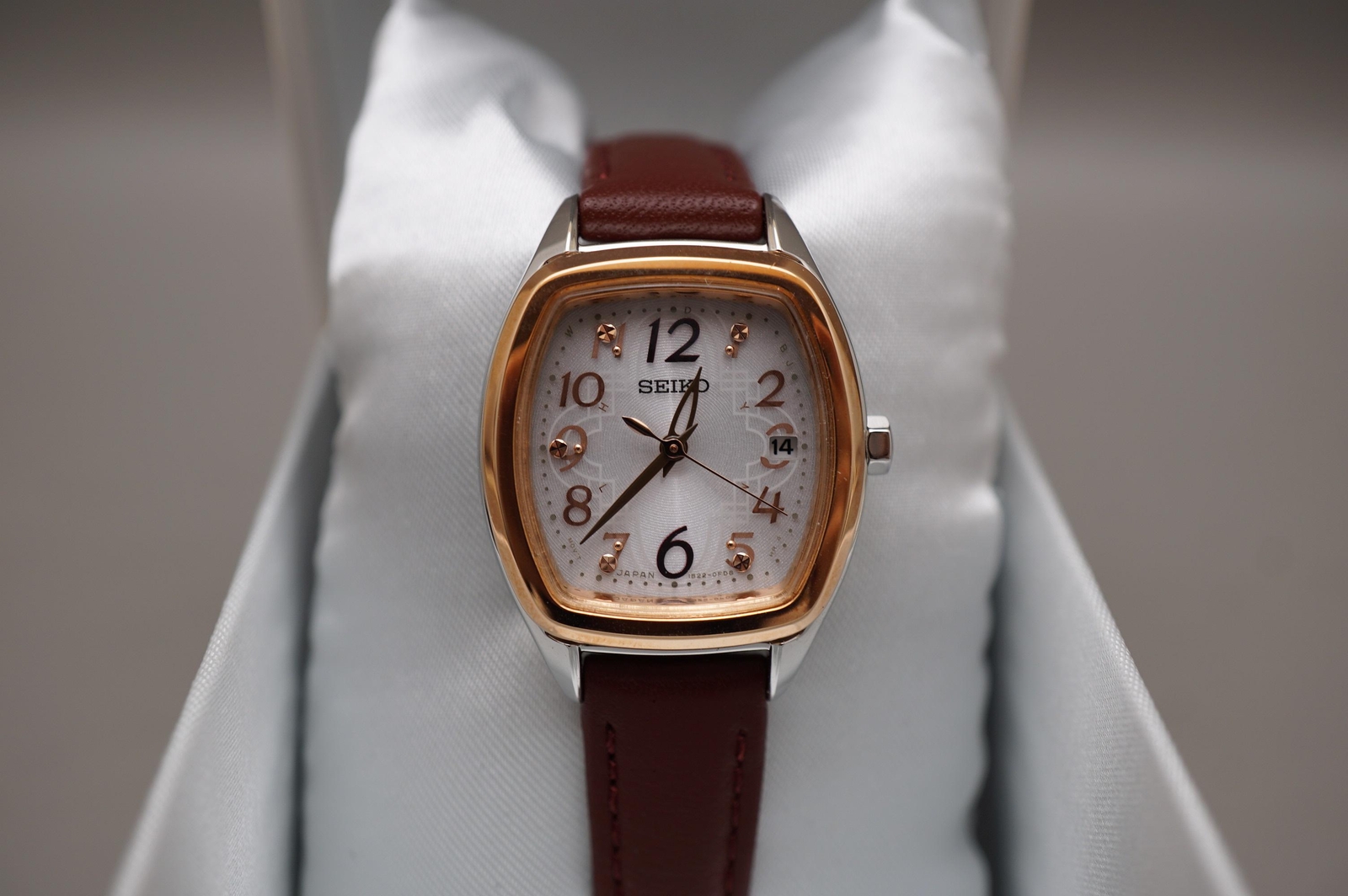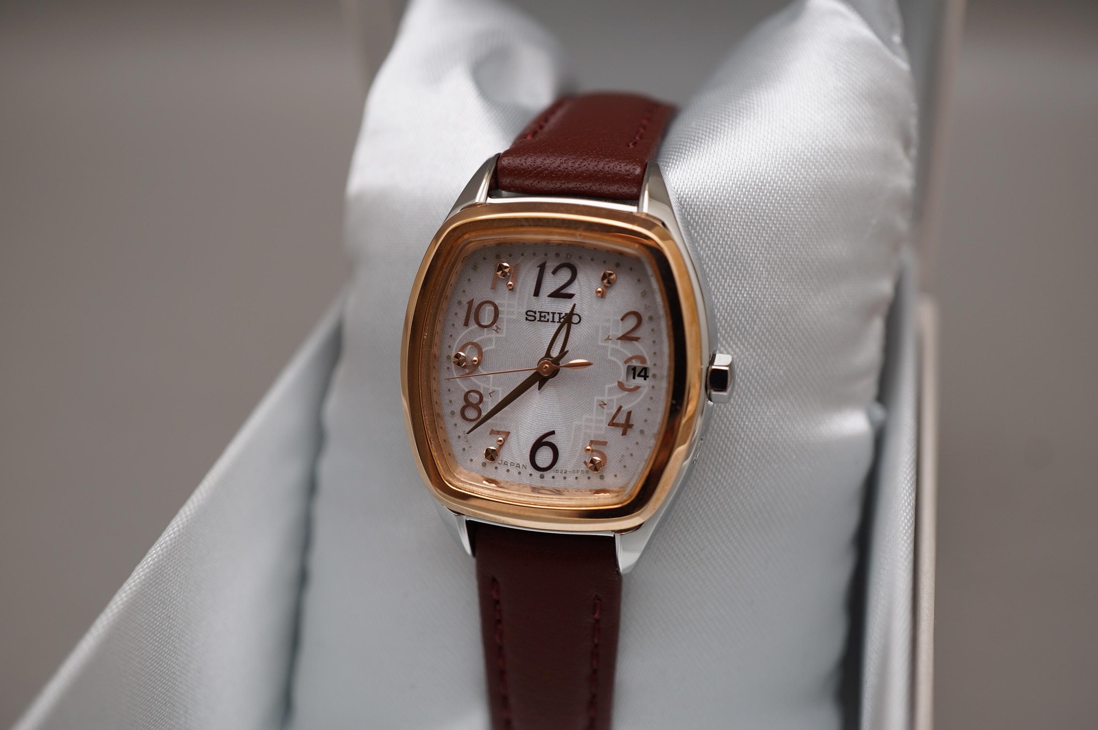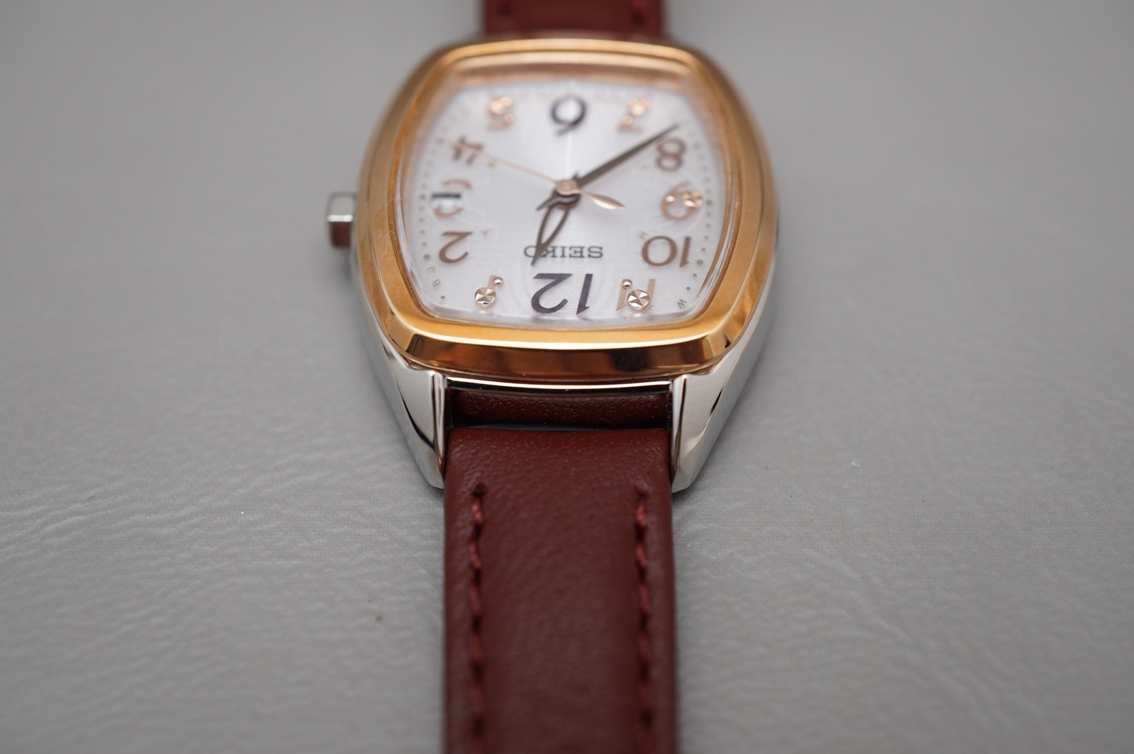 For sale is a Seiko Selection SWFH086 Rose Gold Tone Two Tone Radio Wave Solar Quartz Jdm Ladies WatchMovement: 1B22 QuartzCondition: UsedStrap: Original leather Box: OriginalWarranty card: Stamped 2018-3-22Manual: YesRadio wave time setting is a JDM feature but can be emulated with various phone apps.Approximate measurements:Case diameter: 25.5mm (excluding crown)Lug width: 12mmLug to lug: 33.6mmThickness: 8.5mmPlease inspect all product photos in detail prior to purchase. Item does not include