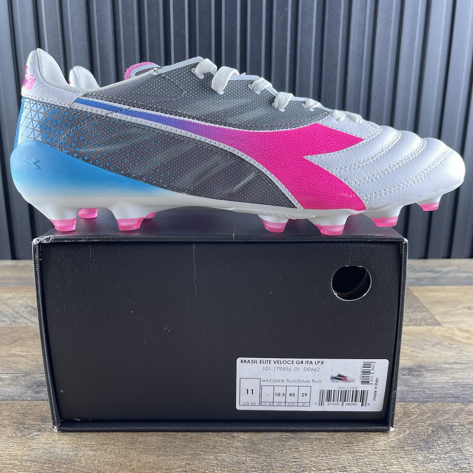Diadora Brasil Elite Veloce GR ITA LPX Size 11 Mens White Pink Blue Soccer Cleat (Includes Storage Bag)D0662New with box-Box may have minor creases or slight damage-We Never sell Fakes! All Products are 100% Authentic.PAYMENT: Immediate payment is required.Once payment is received, We will update you with the tracking number within 24-48 hours.Please give us an opportunity to work out the problems before you leave any negative feedback.We aim for 100% Customer Service. If you have any questions, don't hesitate to message us. Thank you!