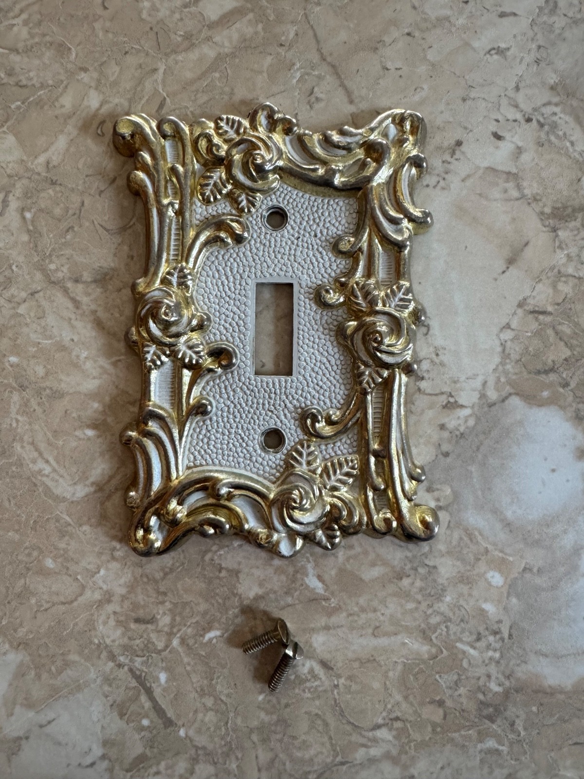 Product Details:Era: 1960s / Mid-CenturyDesign: Ornate floral/rose and scroll motif with a pebble-textured white center.Set Includes: * (3) Single Toggle Switch Plates(1) Double Toggle Switch PlateHardware: Includes original matching mounting screws except for one single plate (as pictured).Condition: Excellent vintage condition with a beautiful aged patina. There is some light, authentic wear to the gold finish and white enamel consistent with age, which adds to the vintage character. Please see high-resolution photos for close-up details of the finish.Dimensions (Approximate):Single Plates: 5.25" H x 3.5" WDouble Plate: 5.25" H x 5" W