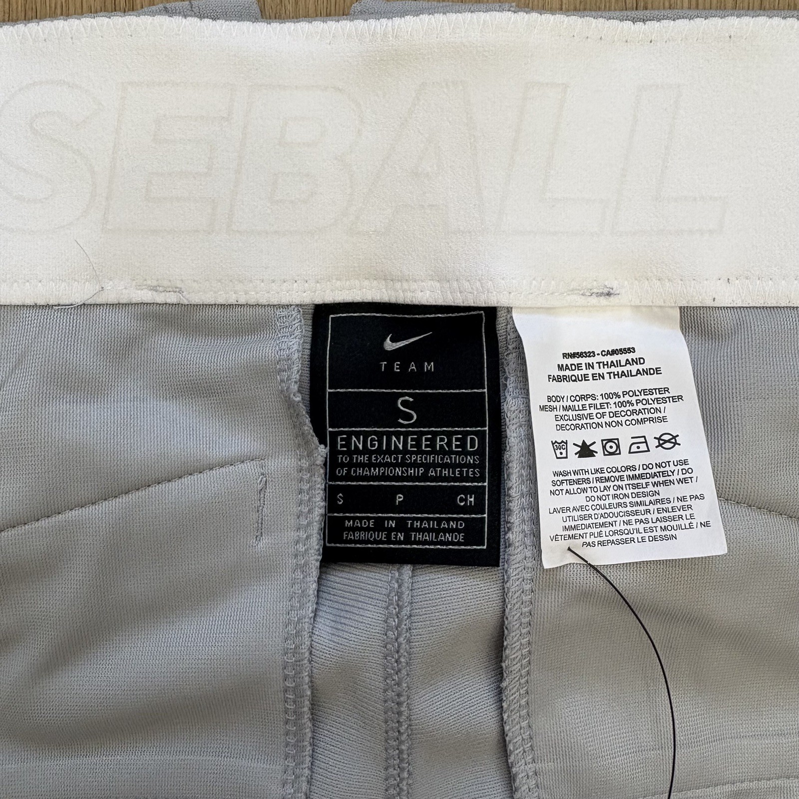 size small, designed in a sleek gray color. These pants are manufactured in Thailand and are ideal for baseball players looking for high-quality, durable clothing to enhance their performance on the field. With the Nike brand name, you can trust in the quality and style of these baseball pants to help you stand out on the diamond.