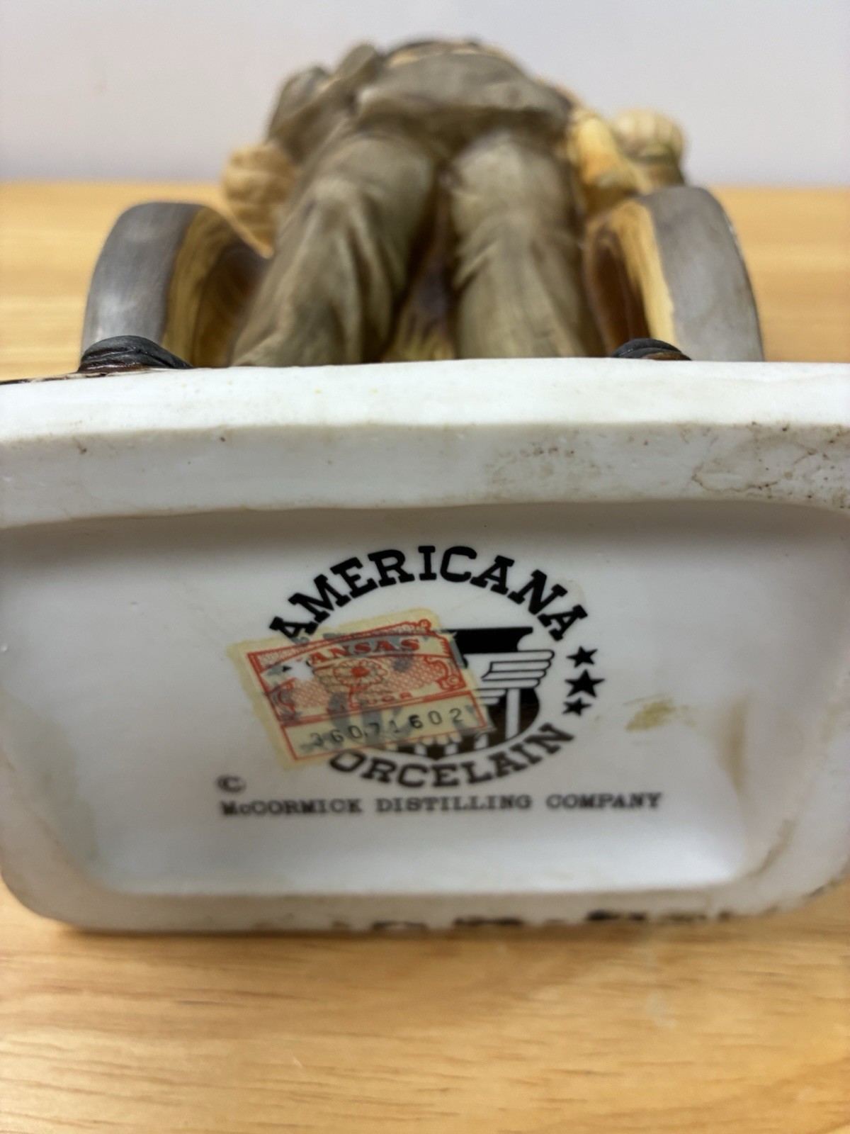 color decanter features intricate details and a theme inspired by the distillery industry. Perfect for collectors of advertising memorabilia, this piece serves as a unique and nostalgic addition to any collection. The head stopper has been broken and glue back with missing pieces and the cork has been replaced.