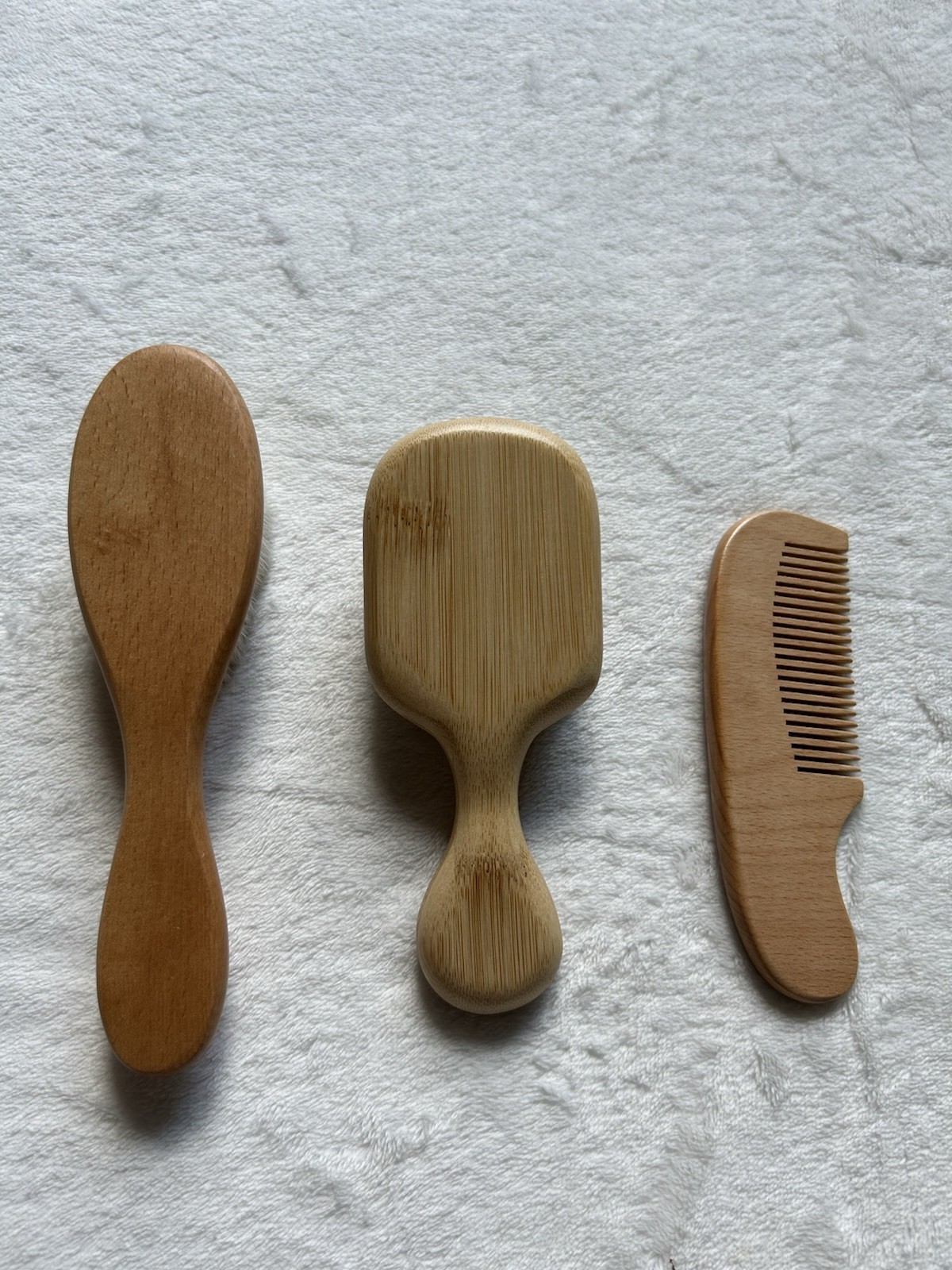 Baby Essential Grooming Set:1- Blue Bamboo Bristle Massage Hairbrush1- Soft Goat Hair Bristle Brush1- Detangler Wooden Comb