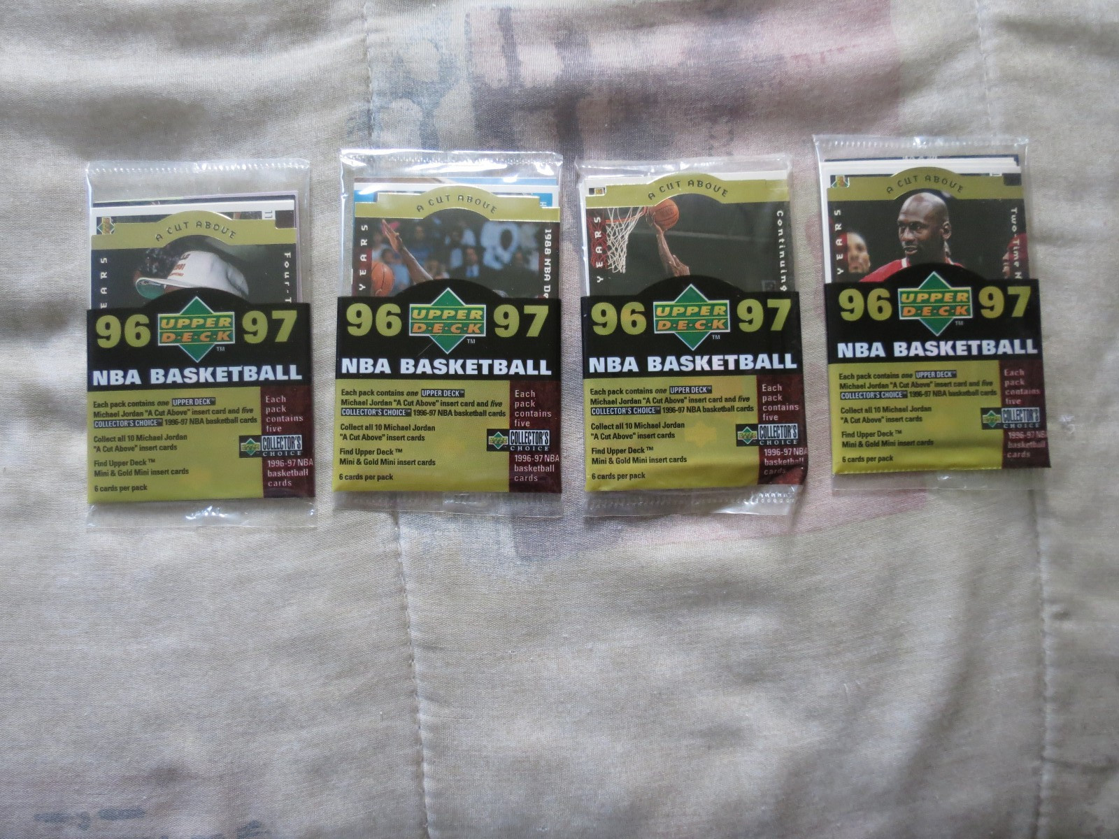 YOU ARE BIDDING ON 1996-97 UPPER DECK COLLECTORS CHOICE BASKETBALL A CUT ABOVE JORDAN PACKS LOT OF 4. EACH PACK CONTAINS 5 CARDS PLUS A DIE CUT JORDAN CARD. YOU WILL RECEIVE THE ACTUAL PACKS PICTURED. PACKS ARE IN EXCELLENT SHAPE AND SEALED. I COMBINE SHIPPING