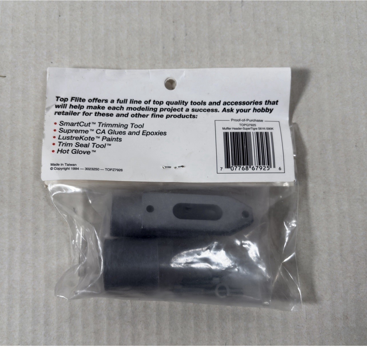 New in package Top Flite warbird in cowl muffler and header. Part # TOPQ7917 ( muffler ) and TOPQ7925 ( header ). These fit the Top Flite “Civilian” airplanes such as the Cessna 182, Bonanza, T34B Mentor, etc…Header has a 47.12mm bolt spacing. This header is for the Super Tigre engines that have the muffler mounting that “Bolt On “ . The threads are in the engine exhaust flange.Header fits the following engines:Super Tiger S K, K (bolt-on)Super Tiger K 91 (bolt-on)