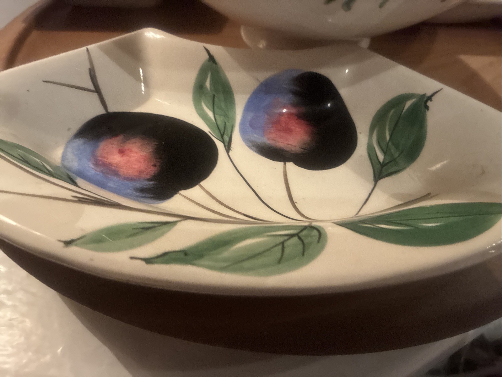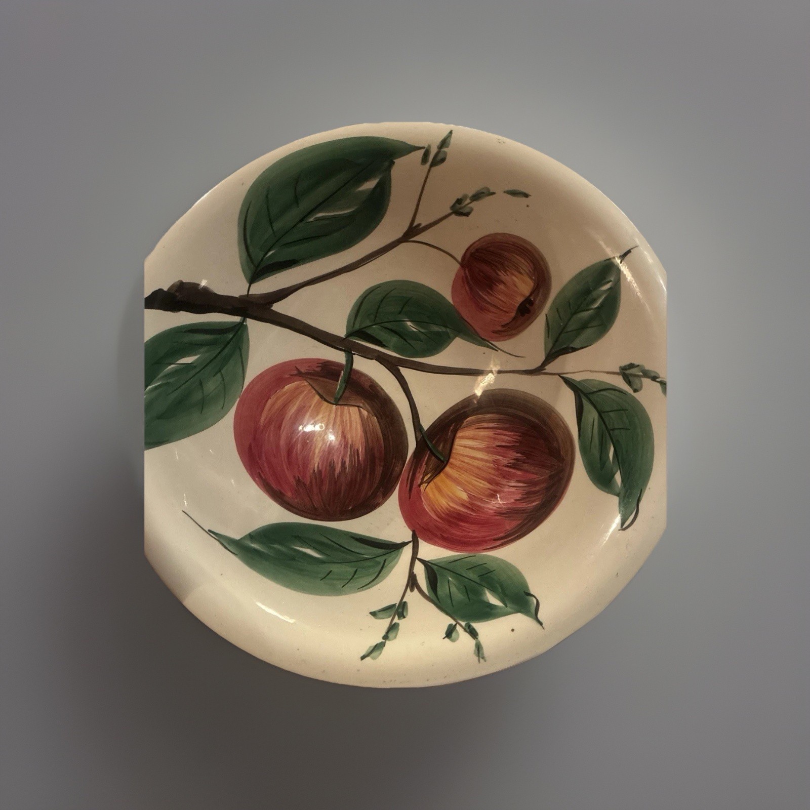 This vintage Lazy Susan dish is a beautiful piece of Italian majolica pottery, hand-painted with a colorful fruit design. Made in Italy, this round ceramic dish features cherries, plums, and apples, showcasing a folk art style. The glossy finish adds a touch of elegance to this original and handmade piece, perfect for serving snacks or displaying as a decorative tray. With a missing piece, this unique and charming dish still retains its charm and character, making it a fine addition to any collection.used