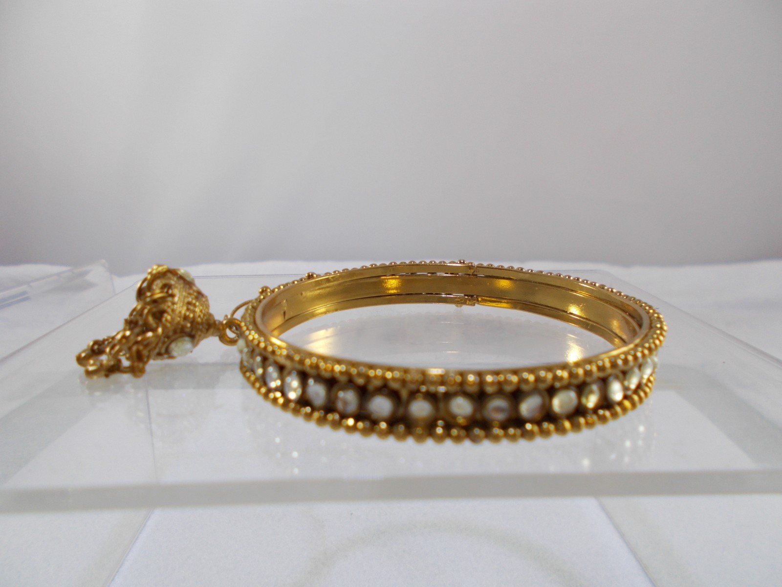 This married set includes a bangle bracelet and dangle earring for pierced ears. They are East Indian Jhumka style with the traditional bells.The gold tone bracelet has one bell dangle and has rhinestones encircling the outside as well as rhinestone accents on the bell dangle. It is 1/4" wide and has inside measurement of 6 1/2".The colorful earrings are gold tone with rhinestone accents and multi