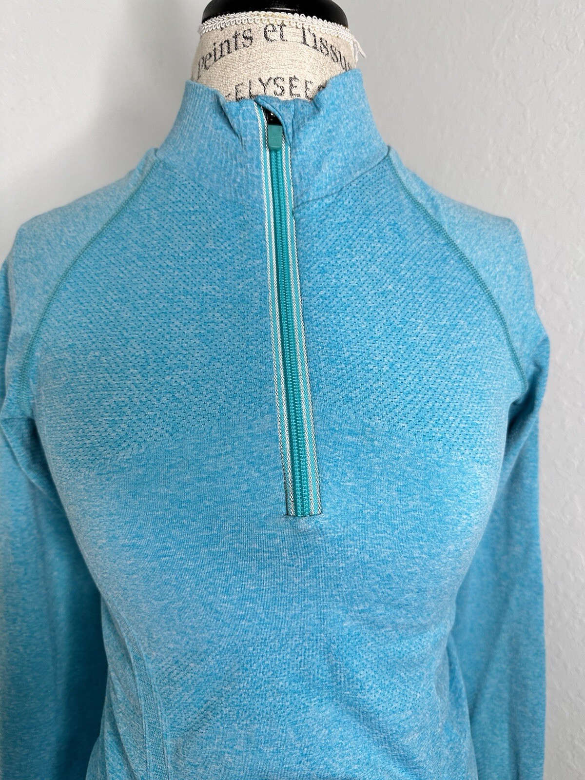 Athleta Fastest Track Half Zip Ruched Shirt Women's Size S Turquoise Thumb HolesExcellent used condition no flaws no stains no fade50%Polyester 45% Nylon 5 % SpandexMeasurements Laying Flat:Armpit to armpit: 16"Back Length: 25"Length Sleeve: 29" (measure from collar to cuff)Clean and from smoke and free environment 7