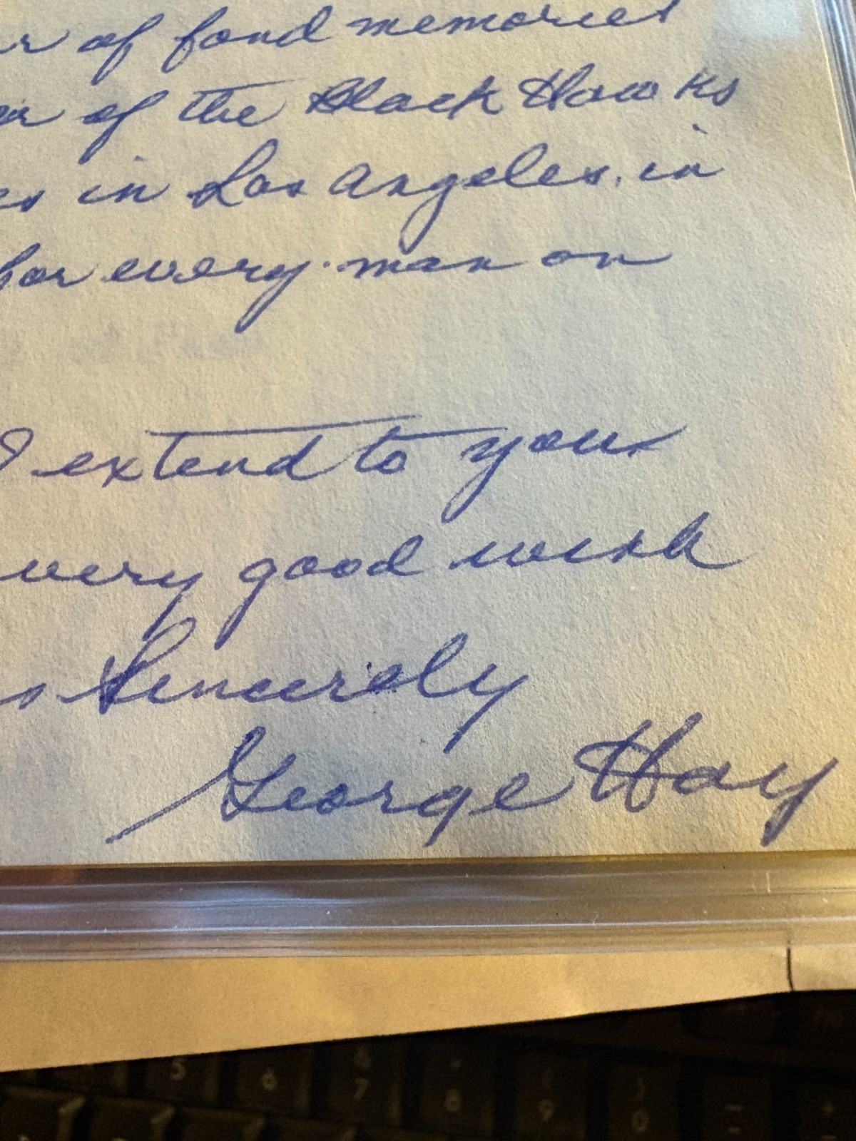 William George Hay Red Wings Blackhawks autographed Letter signed in blue pen. The autographed card comes with a 100% money back guarantee as to its authenticity.