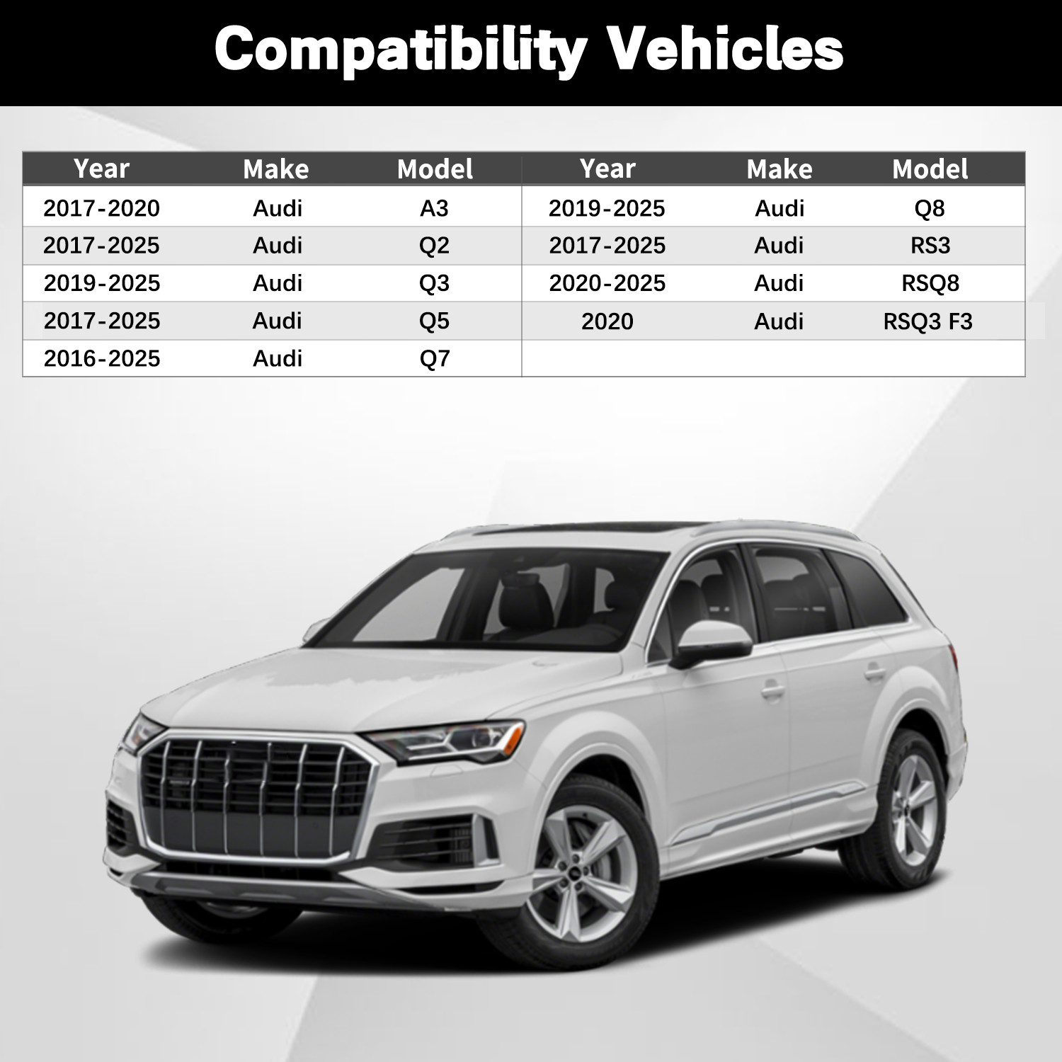 Part Name:Center Console Cup Holder StableBrand:RydSunsLocation:Replace Part Number:4M0885995A 4M0885995C4PK 4M08859954PKProduct Material:Acrylonitrile Butadiene StyreneColor:BlackFitment:Fit For 2017-2020 Audi A3 Saloon/Sportback 8V Fit For 2017-2025 Audi Q2 GA Fit For 2019-2025 Audi Q2 L81Fit For 2019-2025 Audi Q3 (CN)Fit For 2019-2025 Audi Q3 F3 Sportback Fit For 2017 Audi Q5 FY Fit For 2018-2025 Audi Q5 FY Sportback Fit For 2016-2017 Audi Q7 Fit For 2016-2025 Audi Q7 4M Fit For 2019-2025 Audi Q8 4M Fit For 2017-2025 Audi RS3 Sportback 8V Fit For 2020 Audi RSQ3 F3 Sportback Fit For 2020-2025 Audi RSQ8 4M Warranty:1 yearInclude Packing:1 x Center Console Cup Holder StableAdvantage:High-Strength Materials: Made from ABS plastic and stainless steel, wear- and corrosion-resistant for lasting durabilityStable Gravity Design: Unique structure keeps drinks secure during bumpy ridesVersatile Storage: Fits various cup sizes and small items, meeting diverse needsAnti-Slip Silent Lining: Silicone pads prevent sliding and noise for a comfortable rideElegant Interior Blend: Sleek design enhances vehicle luxury and aestheticsEco-Friendly & Cleanable: Environmentally friendly, low-emission, with a waterproof surface for easy maintenance-------------------------------------------------------- About Shipping ------------------------------------------------------ This product will be shipped for free directly from our U.S. warehouse within 48 hours after purchase.We’re committed to fast processing and dependable service — feel free to shop with confidence!