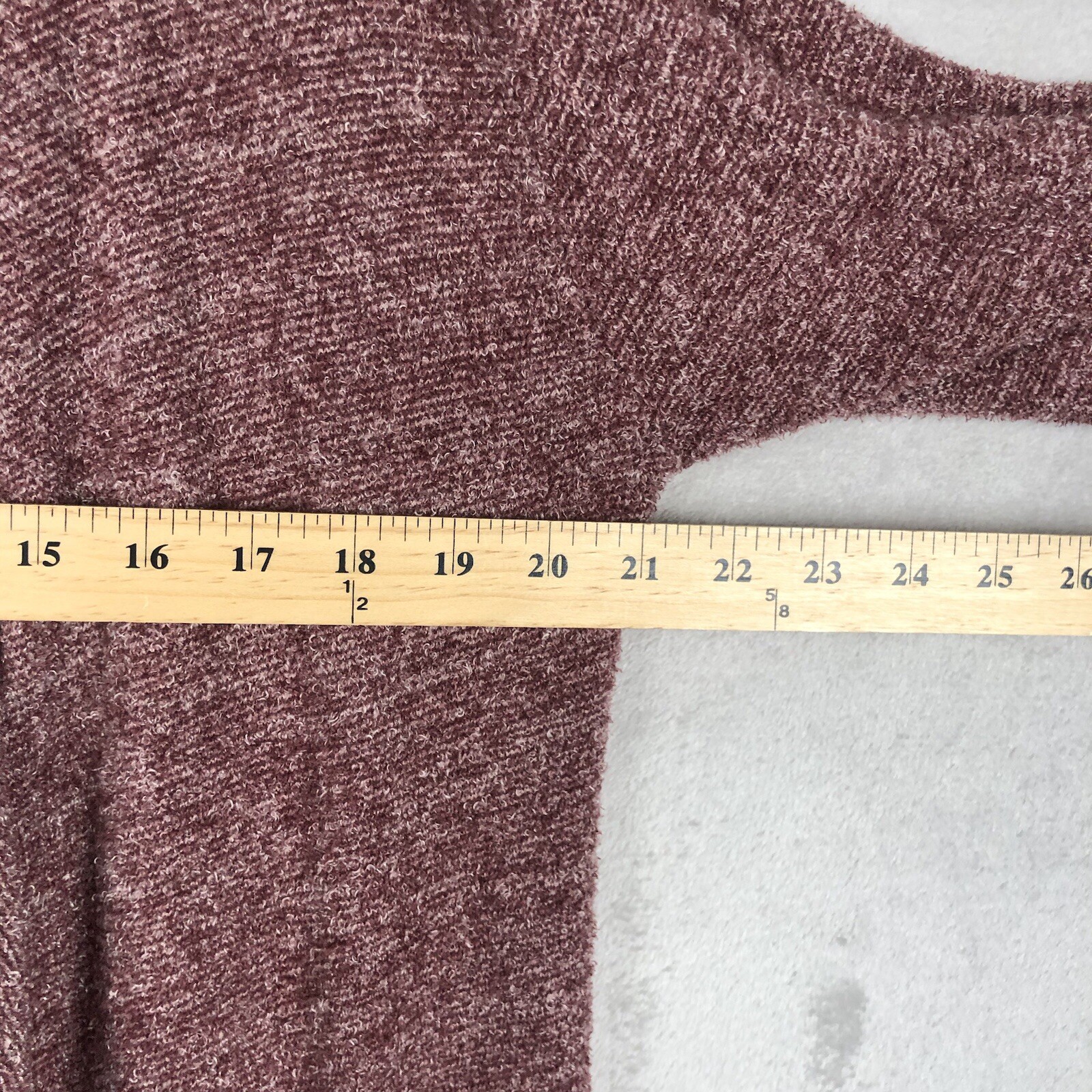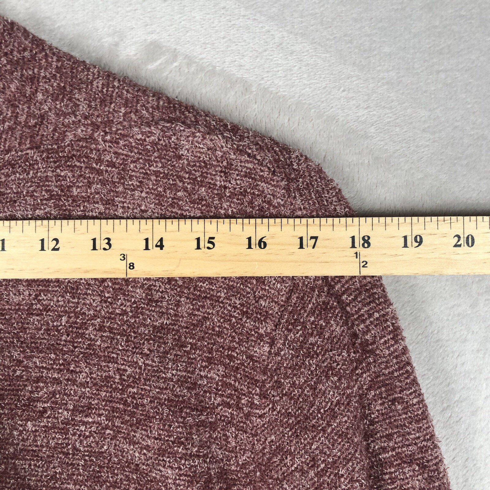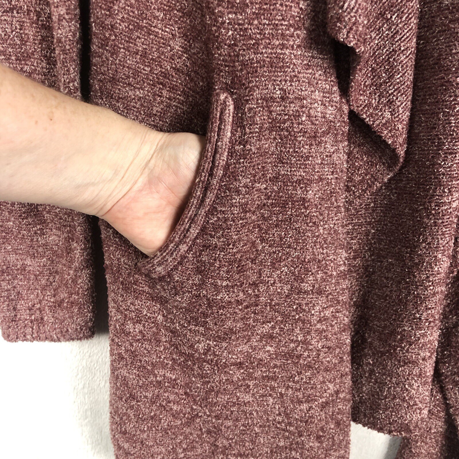 size L/XL feathers a tight-knit design in a heathered wine color. The cardigan has an open front waterfall neckline, long sleeves, and a relaxed fit. Made from a stretchy and cozy nylon/rayon blend knit fabric, it includes pockets and is machine washable. Ideal for travel, casual wear, or work attire, this sweater has a bohemian and classic style, perfect for winter, fall, or spring.Very good preowned condition; no issues. See pics for measurements and details. All items ship from a pet-free and smoke-free home, and are inspected, cleaned (where appropriate) and shipped with care. Feel free to message me here with any questions. Thanks for browsing!