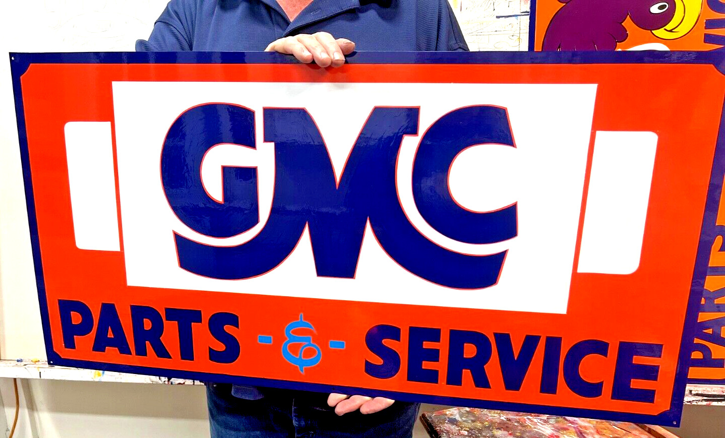 This is an Original Hand Painted sign by HOTRODSIGNS. WE WILL MAKE A SIGN LIKE THIS FOR YOU UPON YOUR PURCHASE. It measures approximately 18"x36".This sign is Painted and Hand Lettered on an enamel coated metal finish, with holes for mounting. Colors: BACKGROUND ORANGE WITH BLUE LETTERING. We use quality lettering enamels, so Our signs will last for years to come, and can be used indoors or outdoors... We use the GMC logo in this sign to create our own unique twist, it is made with our own Style, hand lettered by Hotrodsigns. This is not a copy of any old GMC Sign, so you won't find another exactly like it...The Sign may have some Scuffs and Scratches , as well as imperfections in the paint,... We have been hand lettering our signs for over 40 plus years__________________________________________________________________________________________________________________________________________________________________________________________________________________ There are some sellers on Ebay that are selling our artwork as Old Original Porcelain SignsWe are the original creator of this layout and design. It was created between 2016 and 2022 by TL PIERCE/ HOTRODSIGNS..They are now being sold online as Old vintage 1950's on Porcelain for hundreds of dollars to buyers that don't realize it's not old... Buyers!!! Do your homework.. You will not find a sign like this anywhere that was made before 2016 since it is our design. and when it was created With that being said, we are offering this nice hand painted sign that is hand crafted by an old sign painter.Please see our other listings for more hand painted artwork, we also do some special orders..THIS IS AN ORIGINAL HAND PAINTED / LETTERED SIGN, < BY HOTRODSIGNS >RETURN POLICY: BUYER PAYS FOR ALL SHIPPING FEES.IF YOUR ITEM IS DAMAGED , PLEASE CONTACT US FIRST WITH PHOTOS INCLUDED OF THE DAMAGE IF YOU WOULD LIKE TO INQUIRE ABOUT A REPLACEMENT.