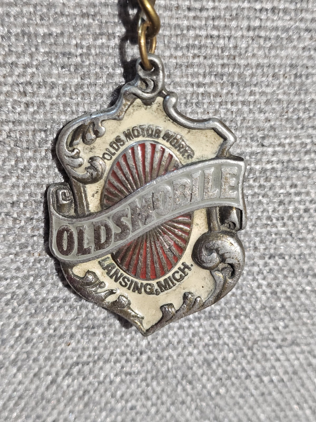 color scheme on your keychain (red sunburst with a white ribbon and black text) was used as the official radiator emblem for high-end models like the Oldsmobile Limited. By 1919, the company moved away from this look toward a "Winged Spur" crest. 2. The Keychain’s Manufacture: Late 1970s – early 1980s While the logo is over 100 years old, the physical object in your hand is a vintage collectible from a later era. Clues: The "Fine Pewter" hallmark and the style of the chain are classic for commemorative automotive merchandise produced in the late 1970s or early 1980s. Purpose: These were often sold at "Oldsmobile" dealerships or car shows to celebrate the brand's long heritage (around the time of the brand's 80th or 85th anniversaries in 1977 and 1982).