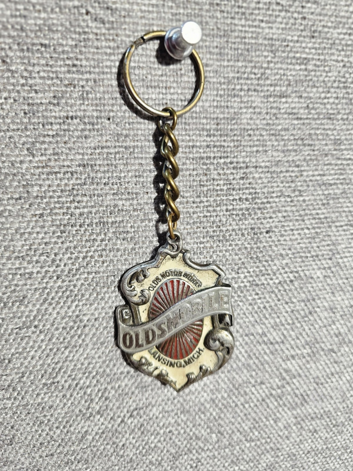 Vintage souvenir keychain featuring the early emblem of Oldsmobile