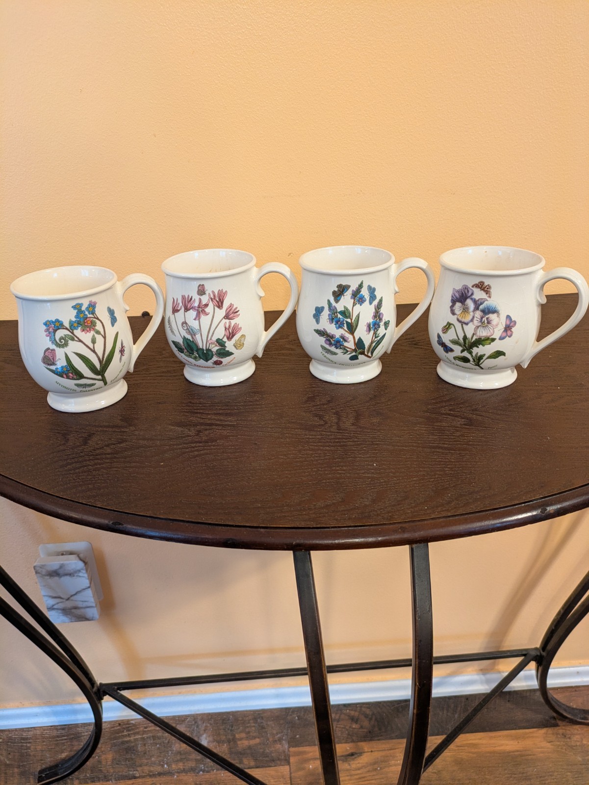 The Portmeirion Botanic Garden Bristol 4-Mugs are high-quality ceramic mugs made in England, featuring a round shape and the Botanic Garden pattern. These vintage mugs are produced using pottery techniques. Each mug showcases the beauty of the Botanic Garden design,. Made by the renowned brand Portmeirion, these mugs are a charming addition to your collection. The Portmeirion Botanic Garden Bristol Mugs Set of 4 mugs. These mugs have significant crazing inside and out. Please ask for additional photos if needed before purchasing. These are listed with no return policy. Veronica, Viola, Cyclamen, Myosotis. Thank you for looking