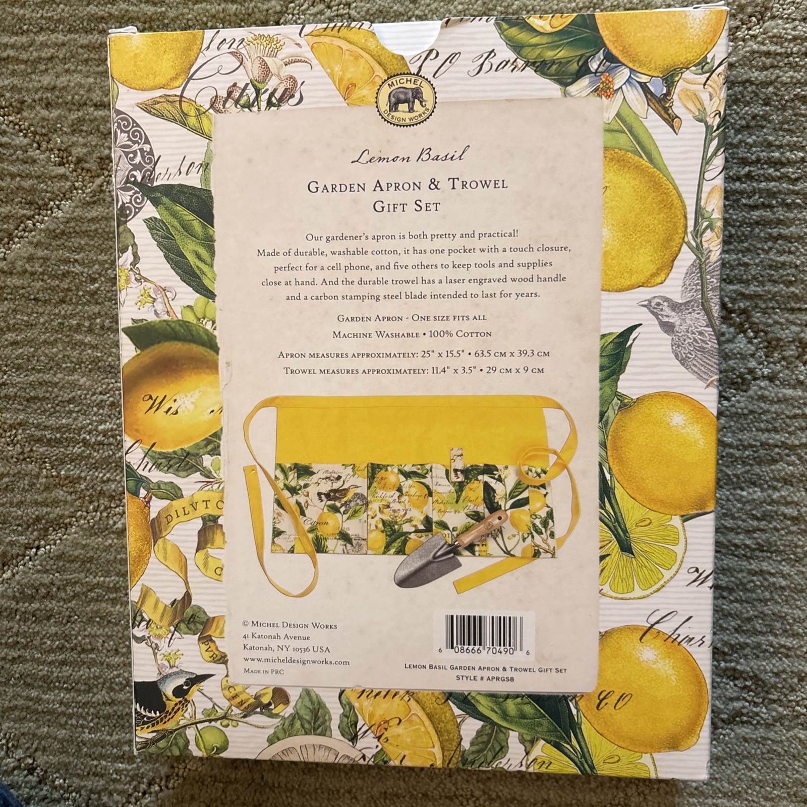Lemon Basil Garden Apron & Trowel Gift Set. Apron is 100% Cotton - One Size Fits All - is pretty (yellow background & ties with lemons, basil leaves & branches & even a bird) & practical. Made of durable, washable cotton, it has one pocket with a touch closure, perfect for a cell phone, & 5 others to keep tools & supplies close at hand - Approximate measurements are 25" X 15.5" (63.5 cm X 39.3 cm). The durable trowel has a laser engraved wood handle & a carbon stamping steel blade intended to last for years. Trowel measures Approximately 11.4" X 3.5" (29 cm X 9 cm).