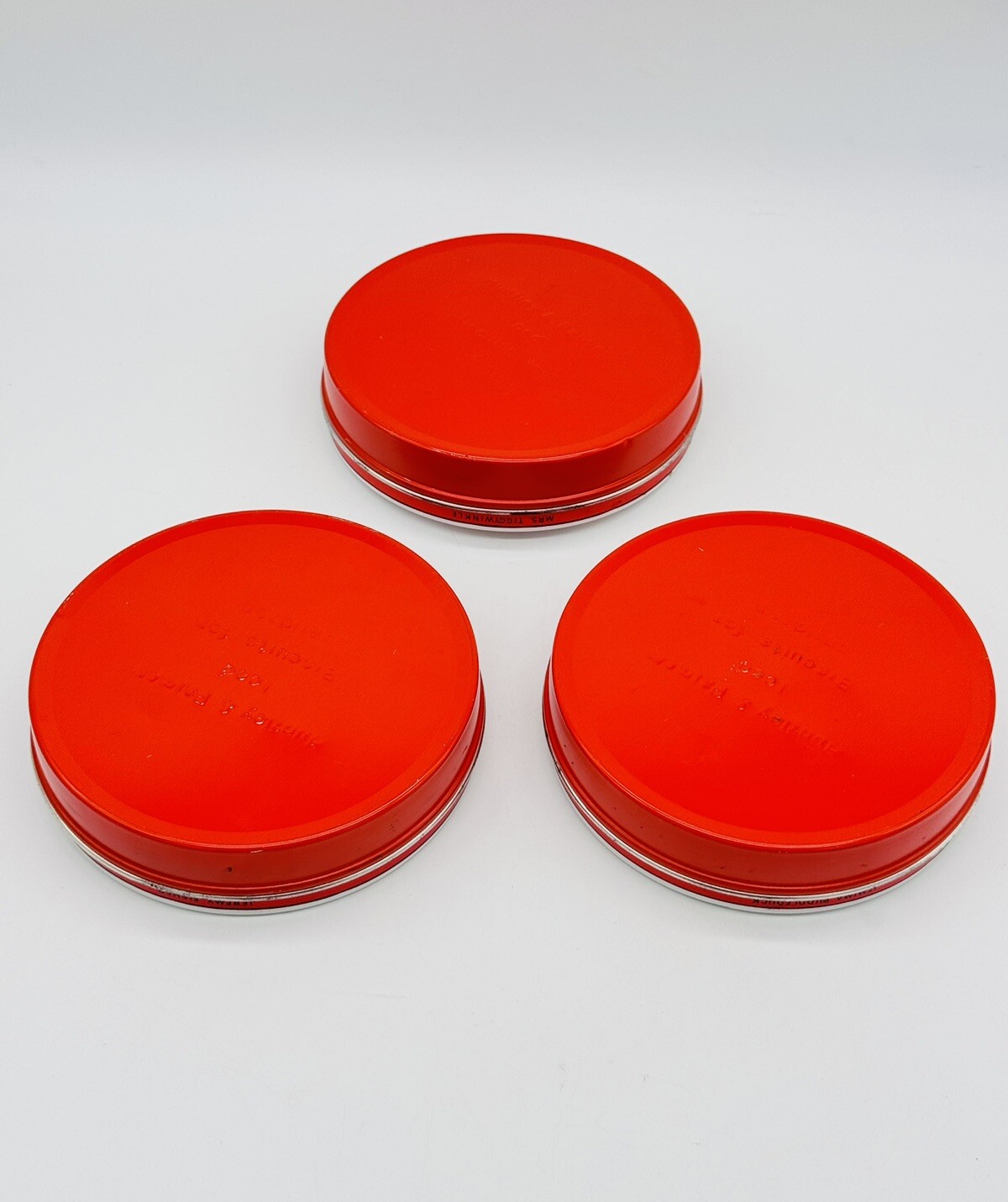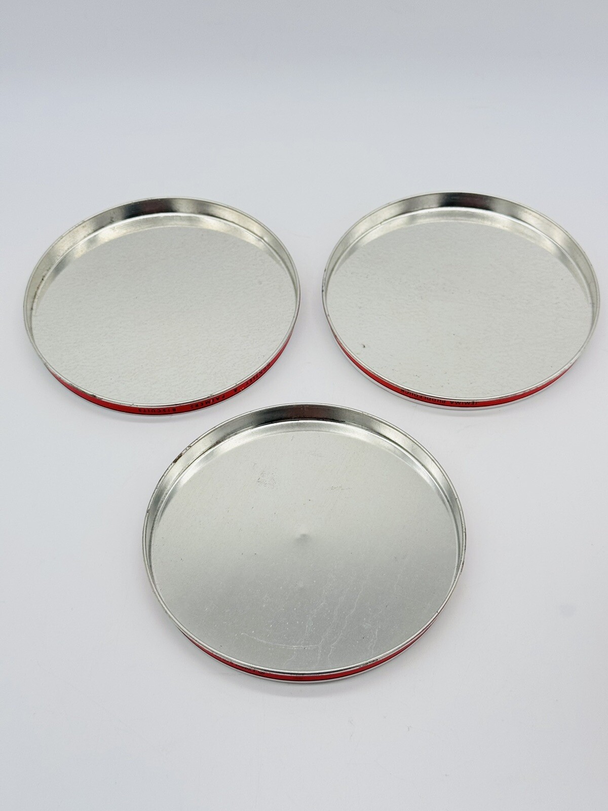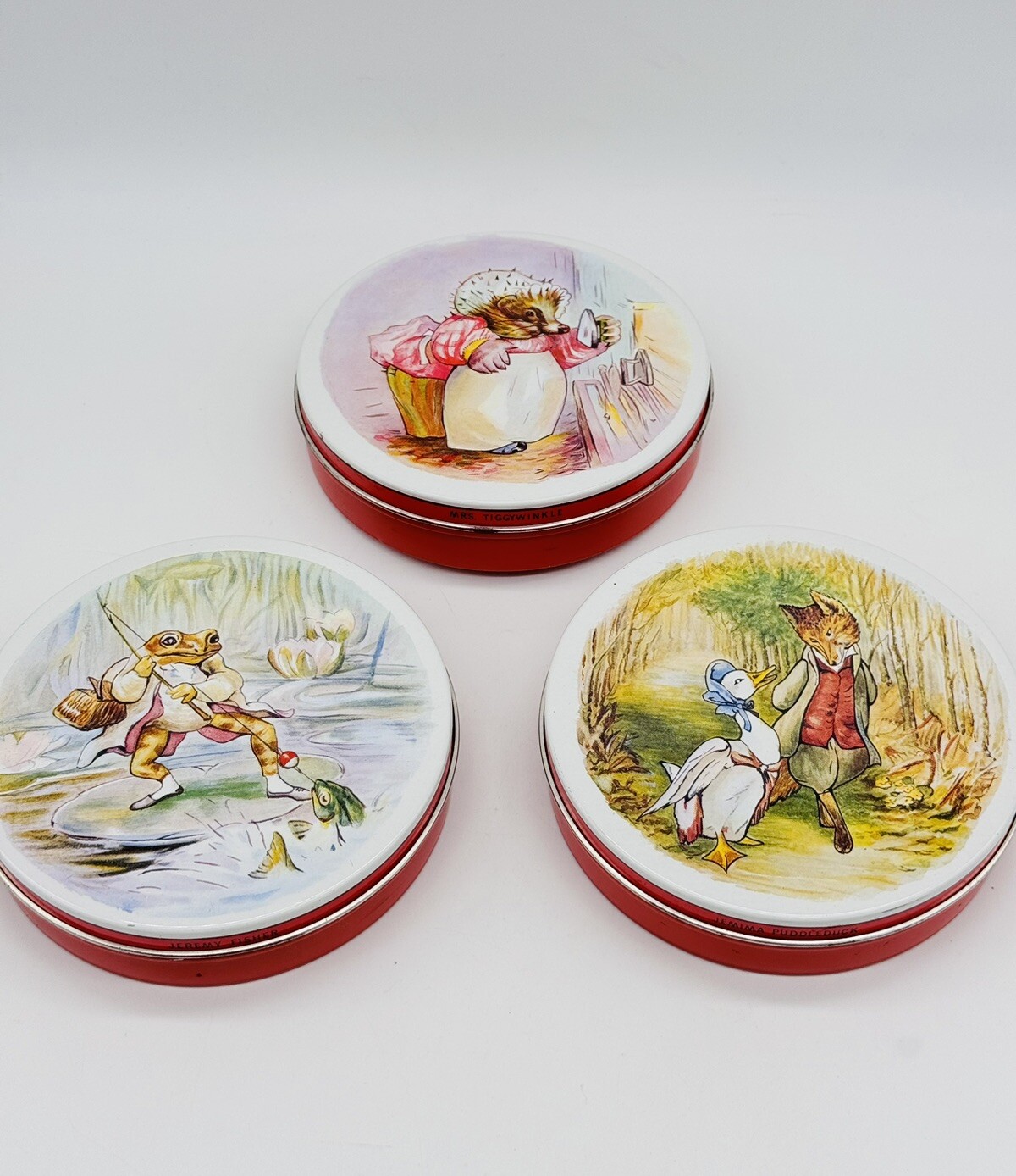 Vintage lot of 3 Beatrix Potter Huntley Palmers Children's Iced Biscuit Tins. Measure 5" in diameter x 1 1/4" tall. Made in England, circa 1960's. Lot includes 1) Jemima Puddleduck 2) Jeremy Fisher 3) Mrs Twiggywinkle. All three have original paper liners. Very good condition for age, few marks and dings. Please refer to photos.