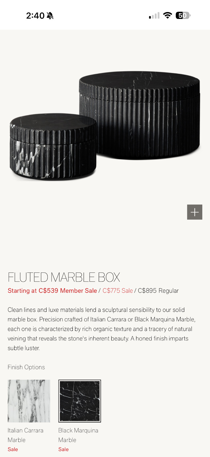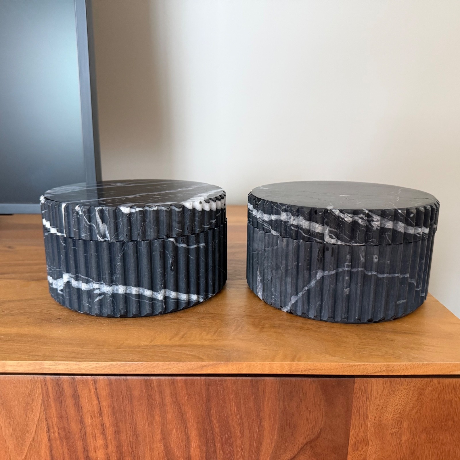 2 Restoration Hardware RH Fluted Black Marquina Marble Boxes w/Lids ~ Each Measures 5.5" Across x 3.5" Tall (Including Lid Height) ~ Excellent Condition from a Smoke Free Home ~ Both boxes are the same