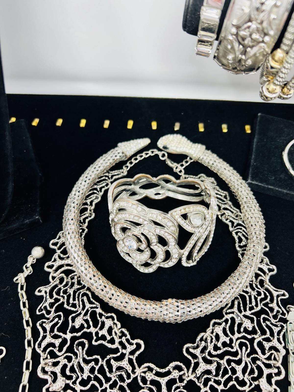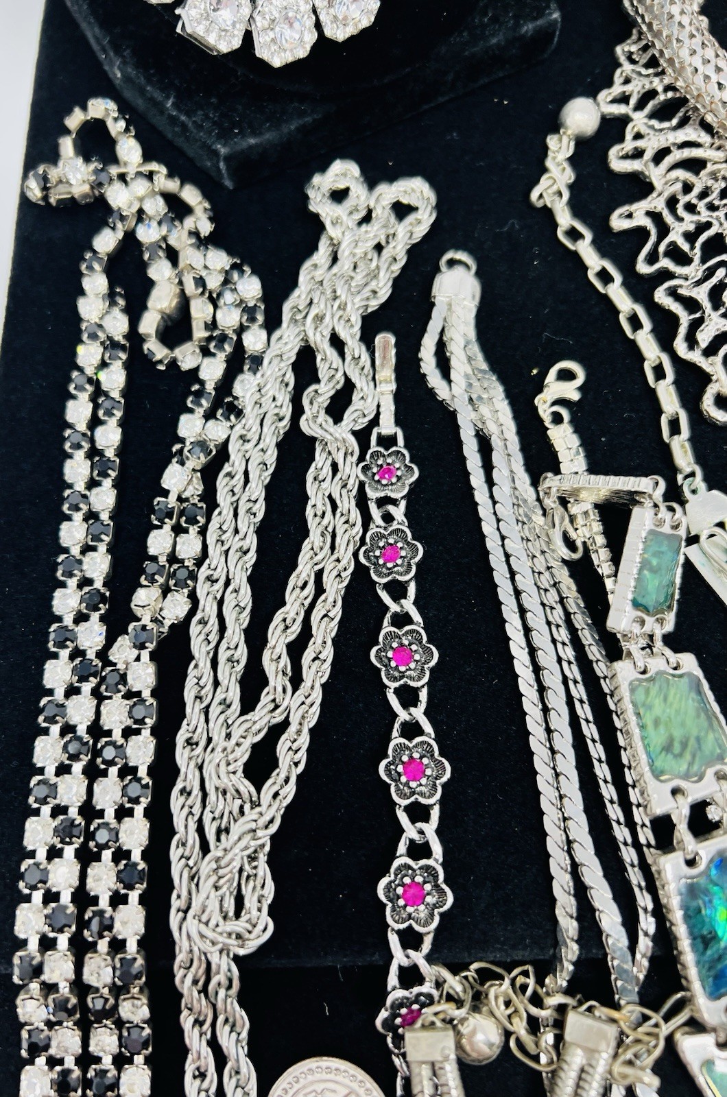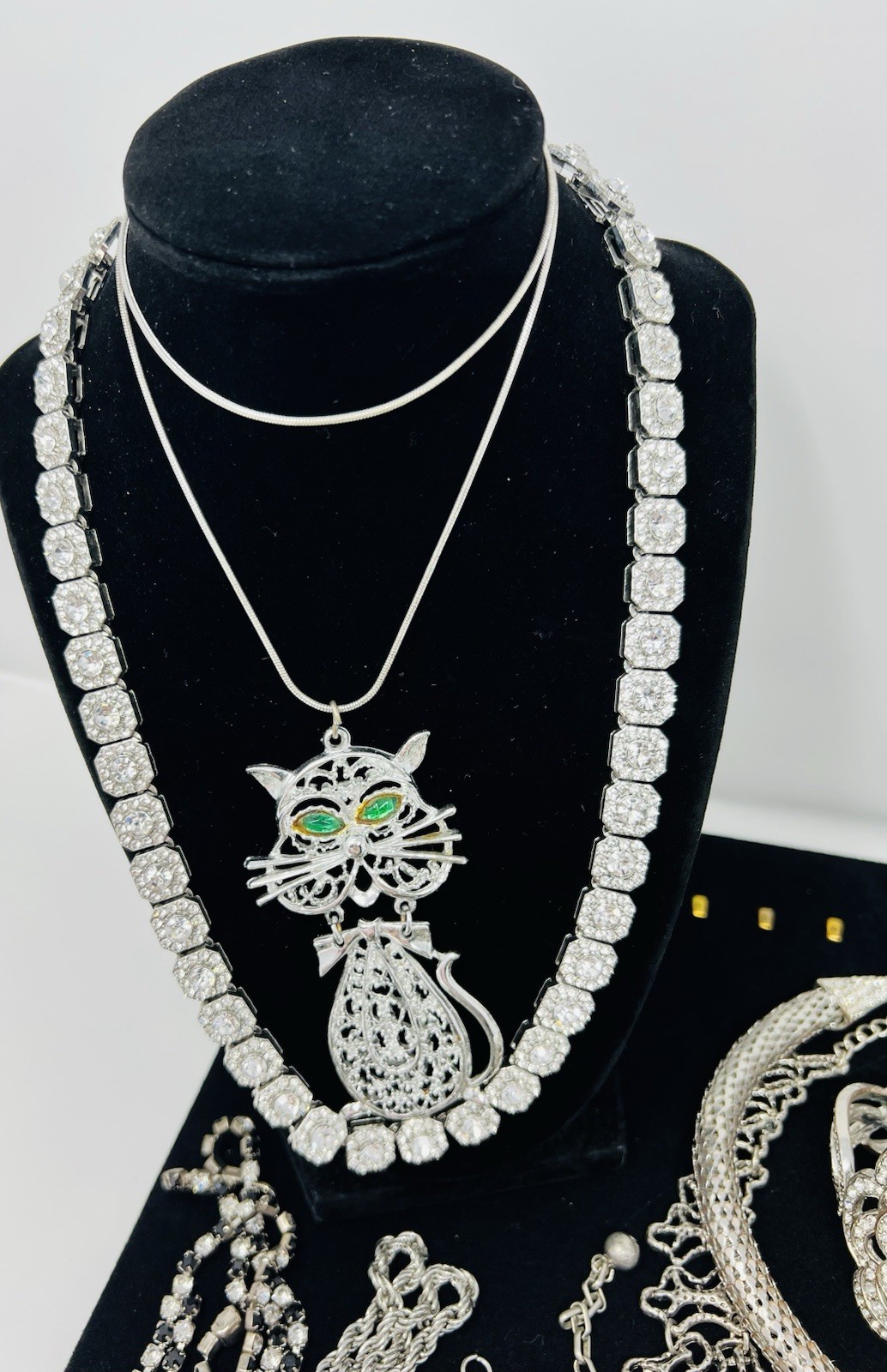 This is an absolutely beautiful assortment of Vintage Classic silver Tone Signed Unsigned Jewelry Lot Of 30. Everything is in overall good condition with some small signs of wear(some discoloration, missing Rhinestone, listed in pictures ). If you have any questions or concerns please let me know. Thank you and happy shopping